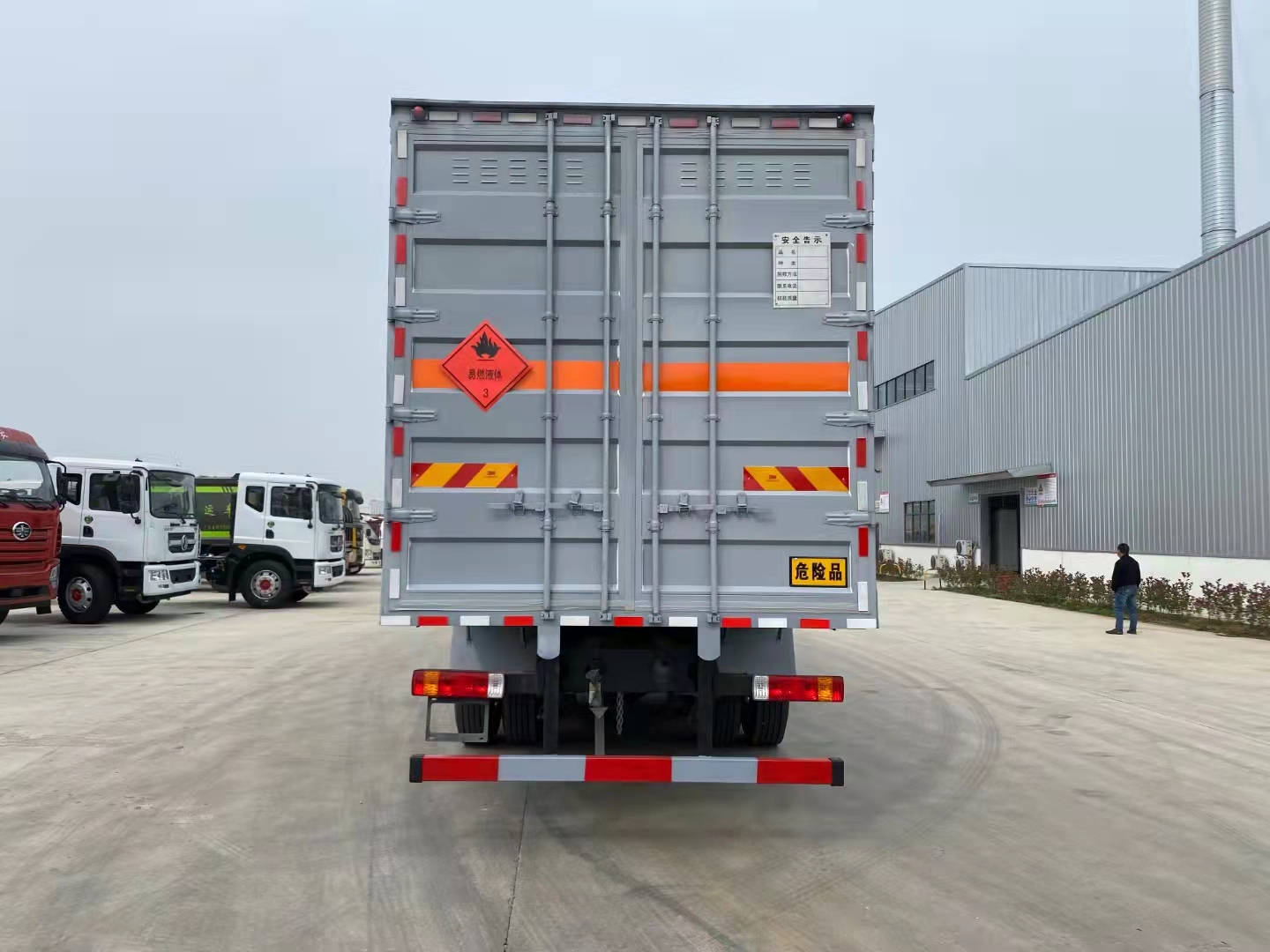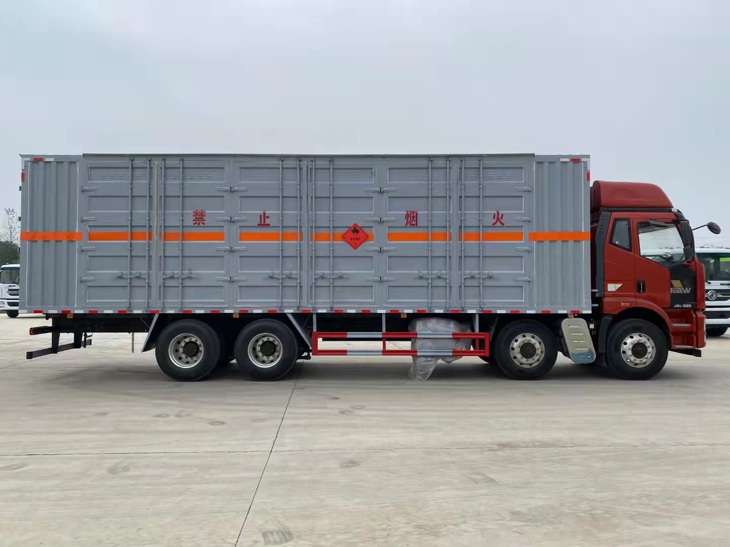 解放前四后八國(guó)六瓦楞板危險(xiǎn)品車采用的是新J6L全浮高頂排半駕駛室、液晶儀表、電動(dòng)玻璃升降、電動(dòng)后視鏡、側(cè)圍網(wǎng)兜、后圍窗簾導(dǎo)軌、全景窗簾導(dǎo)軌、駕駛員座椅為空氣減振座椅、單DIN北斗兼容車載系統(tǒng)、電源總開關(guān)控制開關(guān),大柴CA6DK1-32E61(EGR+DOC+DPF+SCR、雙腔空壓機(jī)、發(fā)動(dòng)機(jī)制動(dòng)),變速箱CA10TA130M變速器(全鋁殼體),車橋ф435沖焊橋(進(jìn)口ABS、1878輪距、2孔V桿),速比3.727,12R22.5型18層級(jí)輪胎(輕量化輪輞、雙錢花紋RR100/朝陽花紋AS578/正新花紋CR260),270×75×(7+5),自動(dòng)空調(diào)、前下防護(hù)裝置、駕駛室四點(diǎn)螺簧懸置、一體式寬體保險(xiǎn)杠、電動(dòng)液壓舉升裝置、后懸2500mm、車輛限速、排氣火花熄滅器、整車配備靜電拖地帶1根、駕駛室?guī)?kg干粉滅火器1個(gè)、懸架3/3/-(8氣囊)、排氣尾管及消聲器前置、前盤后楔式制動(dòng)器、右轉(zhuǎn)彎音響提示、爆胎應(yīng)急安全裝置、安全帶佩戴提醒、制動(dòng)襯片更換報(bào)警、鋁油箱300L、T-box1.5、U型后處理、EBS+ESC、單胎帶TPMS(胎壓監(jiān)測(cè))、鋁貯氣筒、LDW+FCW、天線操縱、排氣節(jié)流閥、AEBS(自動(dòng)緊急制動(dòng))。軸距1900+4500+1350mm。