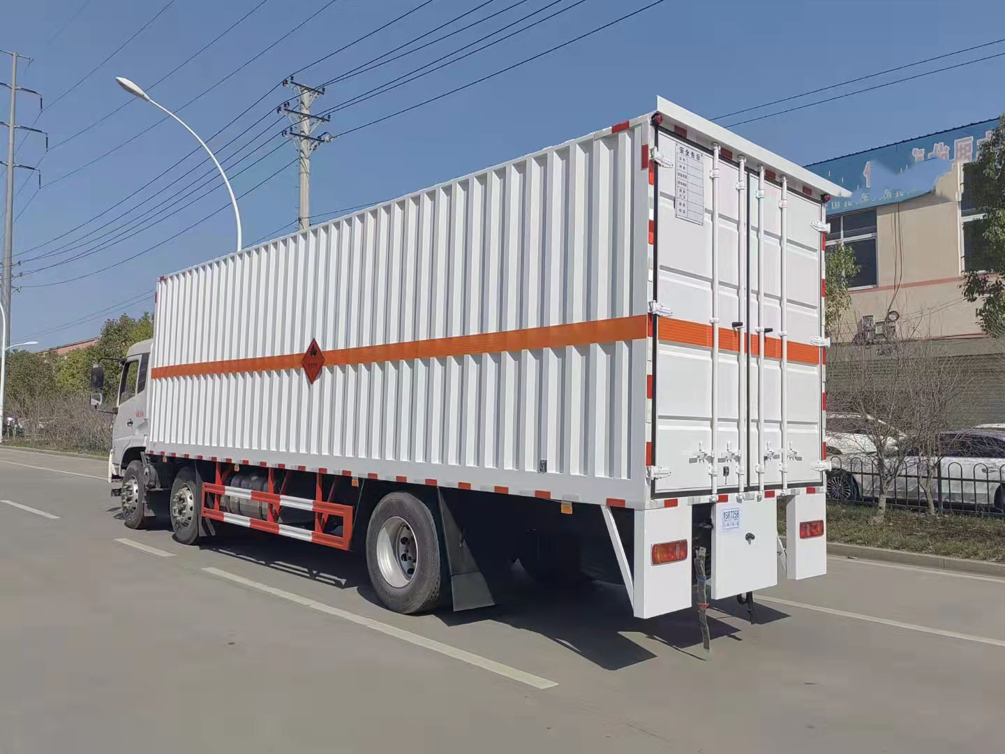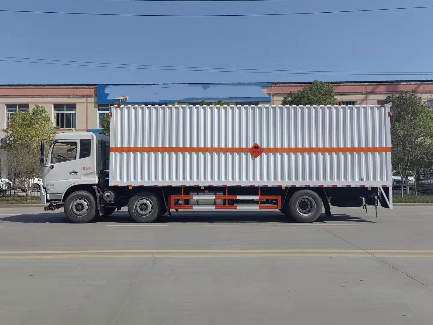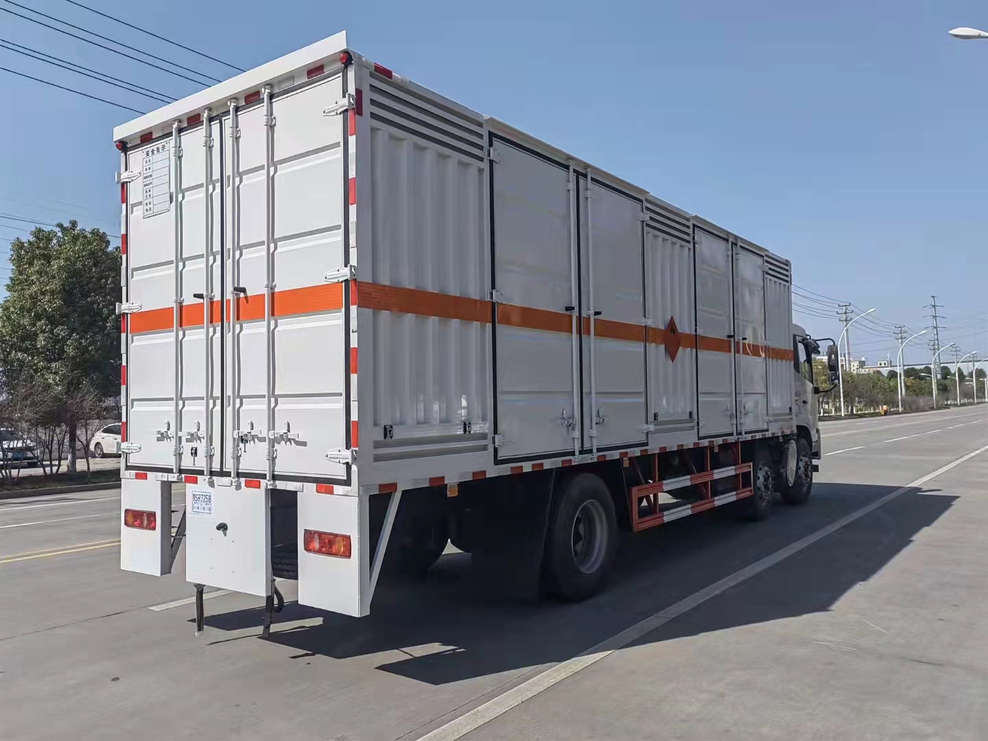 東風(fēng)天錦三軸帶雙開側(cè)門瓦楞板危險品車廂體為金屬骨架結(jié)構(gòu),外板采用靜電屏蔽冷軋鋼板。底板為花紋板,上鋪防靜電膠皮。右側(cè)開單側(cè)門,廂內(nèi)兩側(cè)加裝固定貨物臥環(huán),門框帶防盜報警器,廂體頂部裝煙霧報警器。隨車工具、危險品頂燈、防火帽、兩個滅火器。