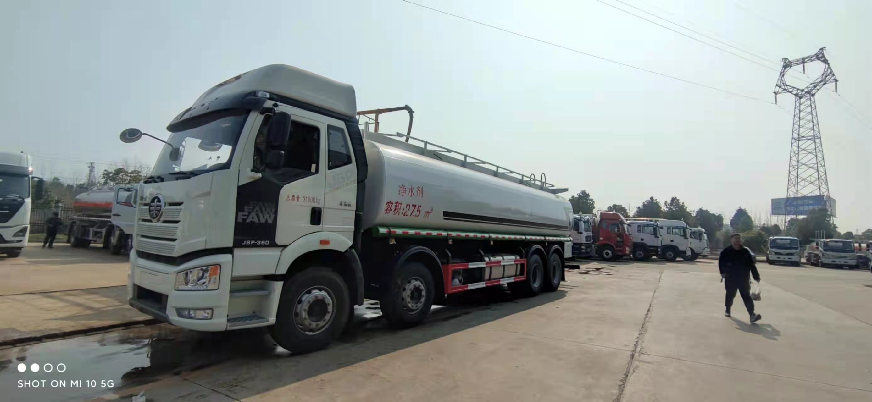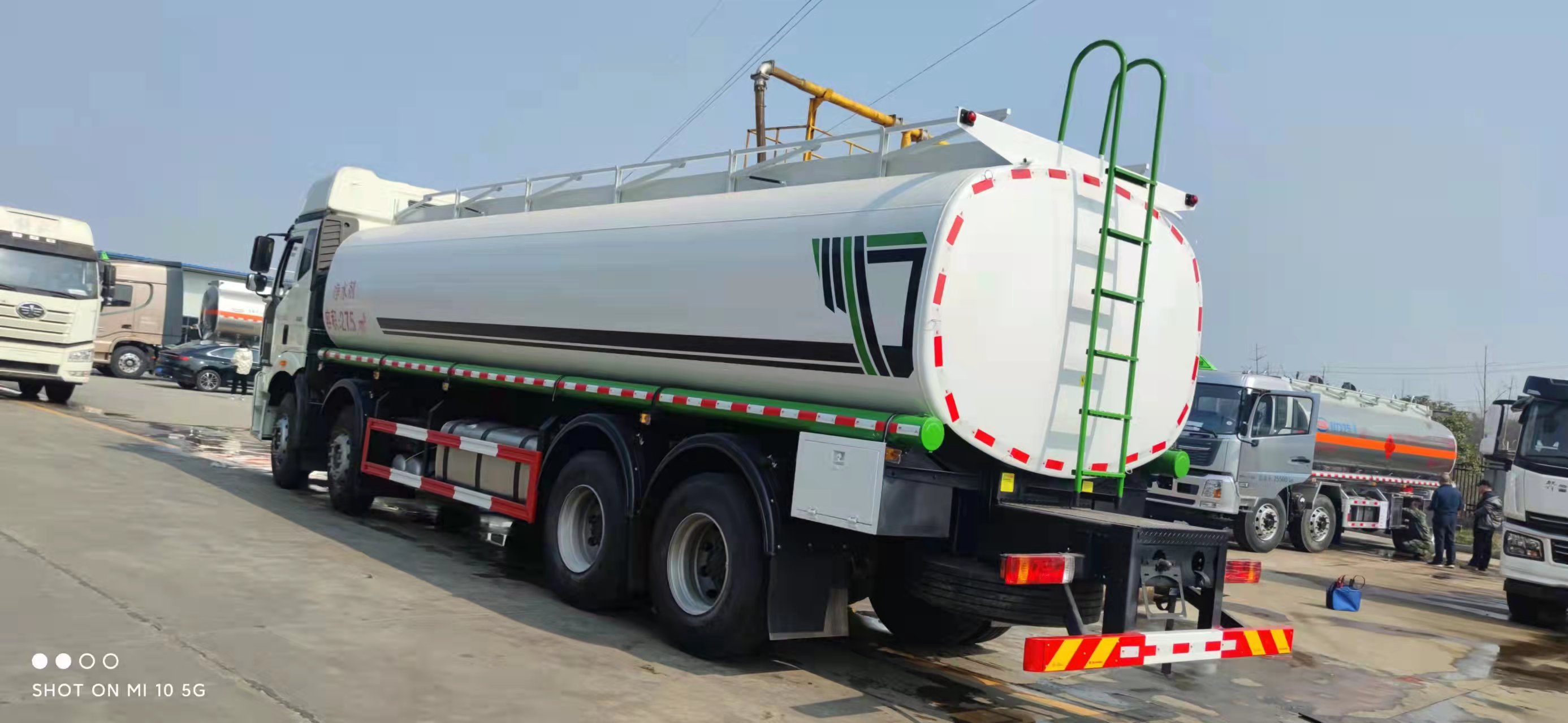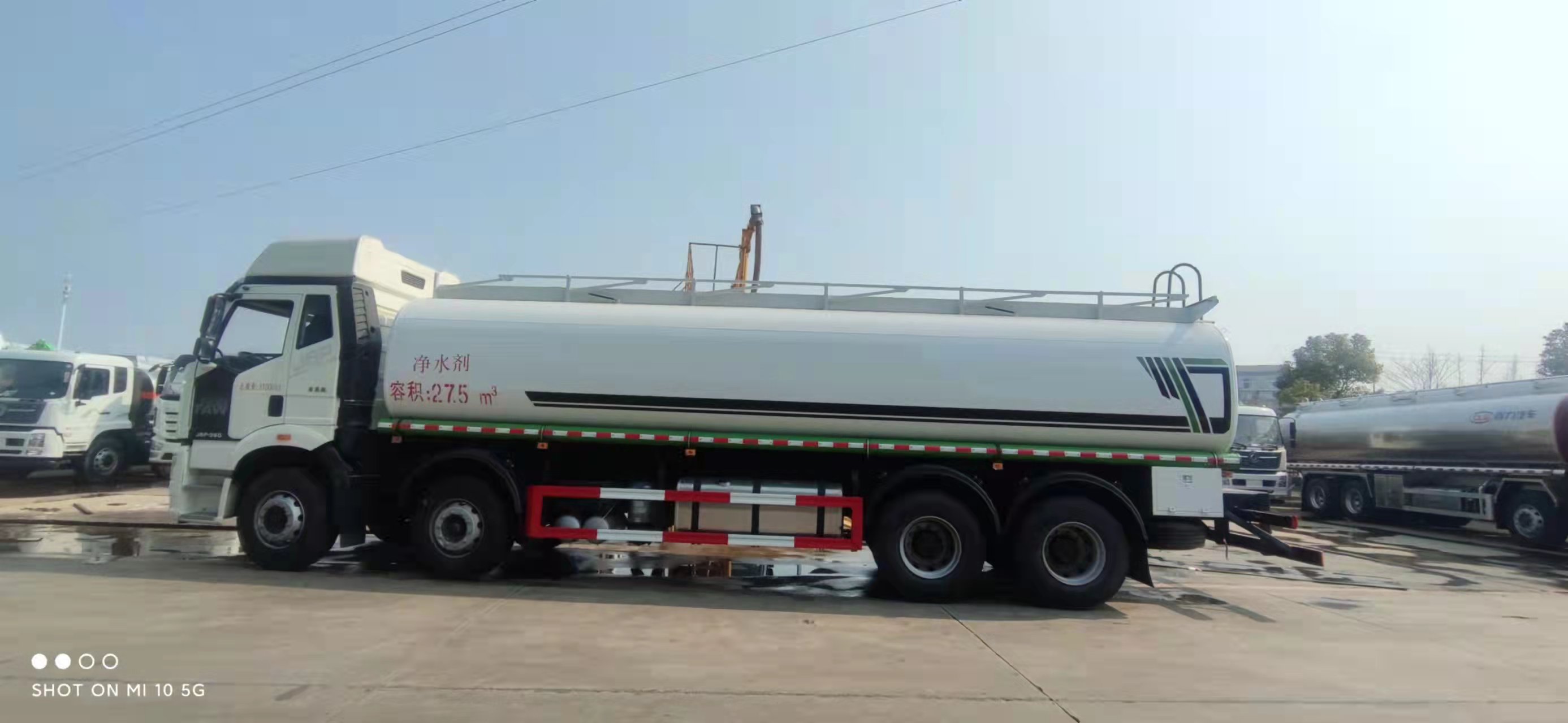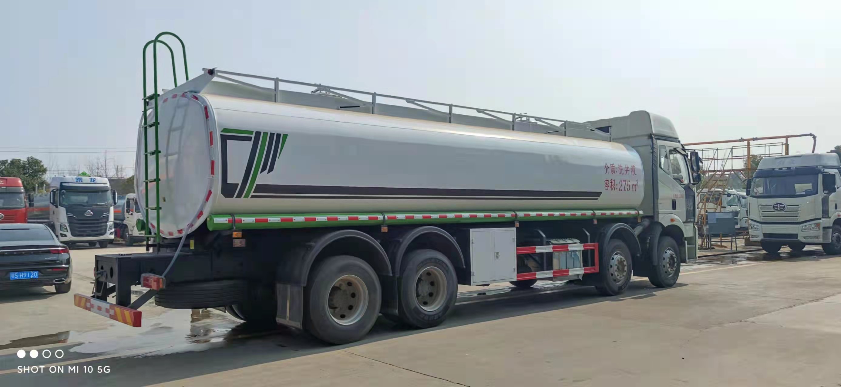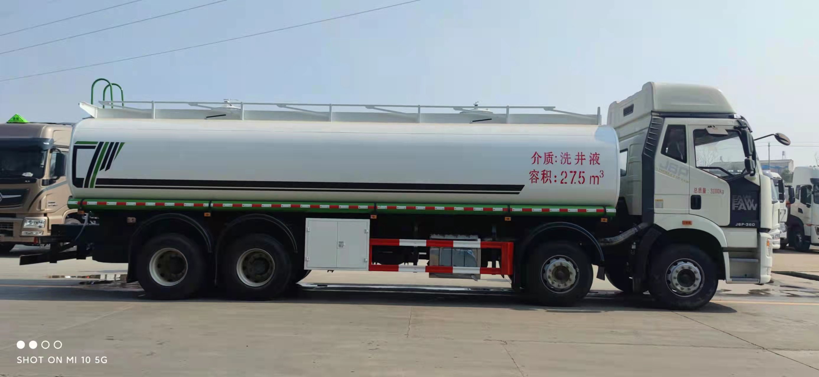 解放J6國六前四后八供液車采用的是J6高頂排半駕駛室、電動玻璃升降、電動后視鏡、單DIN北斗兼容車載系統,發動機錫柴CA6DL6-36E6(EGR+DOC+DPF+SCR氣驅)360馬力,變速箱CA10TA190M2變速器,車橋ф435沖焊橋(自動調整臂、國產ABS、2孔V桿),12R22.5型18層級無內胎,軸距:1900+4700+1350mm,自動空調、電動液壓舉升、VOSS接頭、懸架9/10/10、600L油箱、駕駛室四點空氣懸置、發動機體現10萬公里長換油周期、后懸為2300mm、右轉彎音響提示、180Ah蓄電池、100A發電機、駕駛室內定轉速、排氣節流閥。