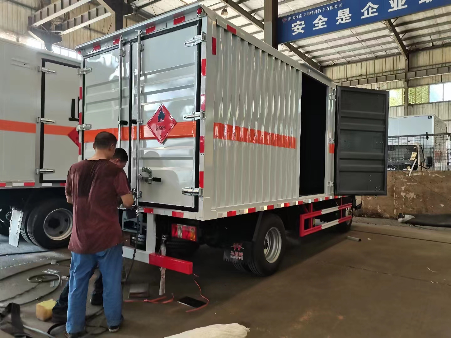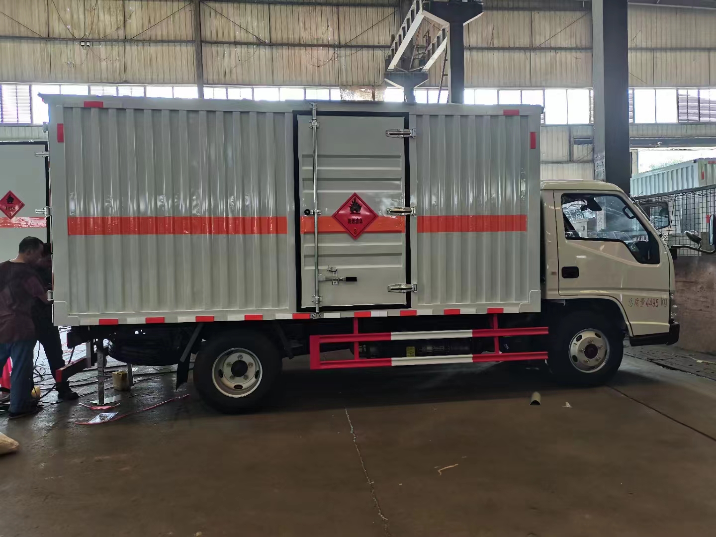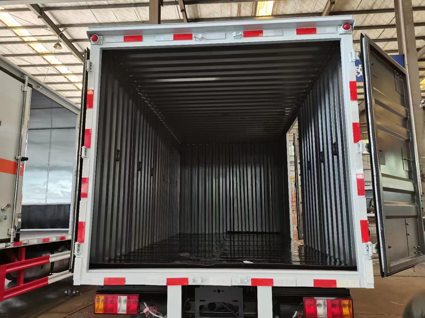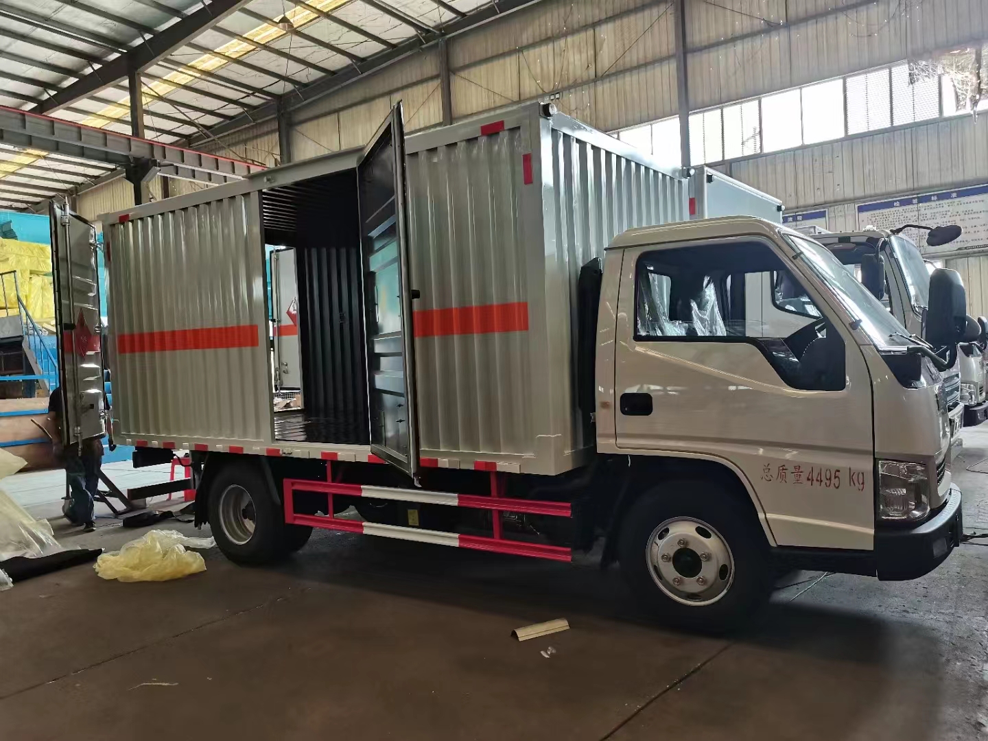 江鈴國六單側門瓦楞板危險品車采用的是新規專用危險品車,122馬力發動機,帶中控鎖、電動玻璃、原廠空調,為了讓車型更好地使用,此次設計的采用的是瓦楞板箱體設計,箱體內部全部采用的是臥環設計,可方便客戶固定貨物,同時該類車型的設計更貼合了車主需求,箱體寬度可做到2.05米,容積更大裝貨更多。重點是裝油漆甲醇乙醇都屬于重載型的車輛,對箱體要求扎實程度更高,所以客戶更加青睞于瓦楞箱體。箱體右側帶中開側門,在運輸過程中臨時搬運車輛也不用擔心。