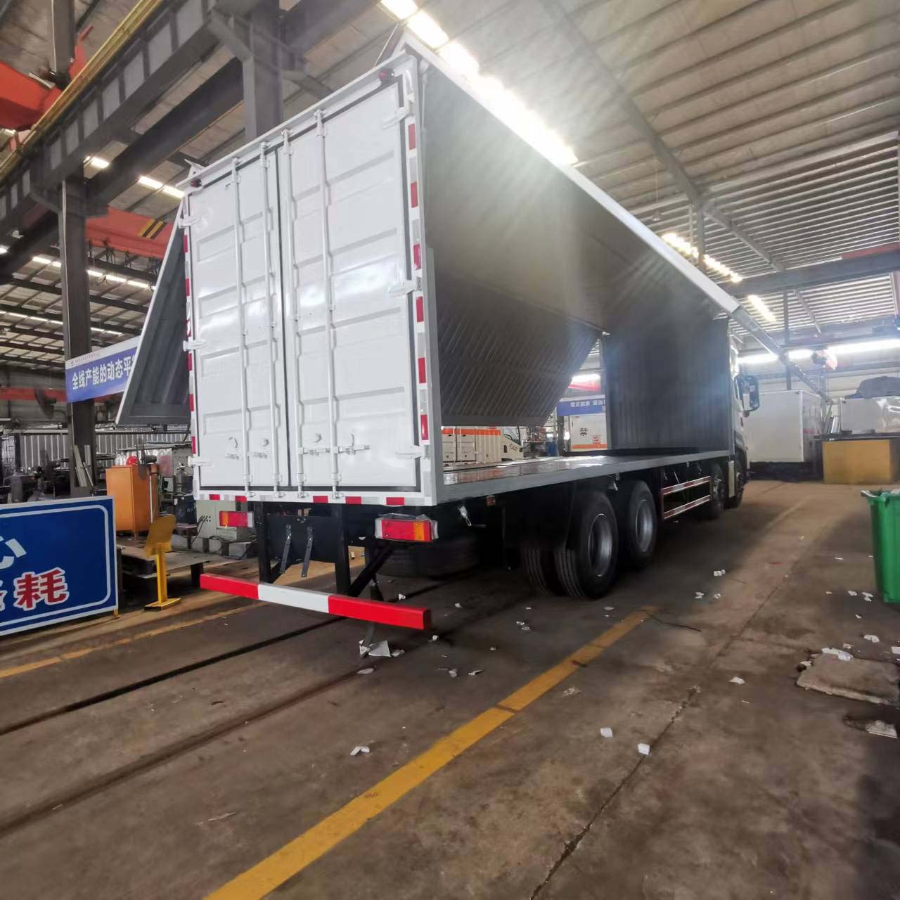 東風(fēng)天龍前四后八國六翼展危險(xiǎn)品車采用的是;穼S玫牡妆P,天龍駕駛室,350馬力發(fā)動(dòng)機(jī),高頂雙臥駕駛室休息更方便,重點(diǎn)是氣囊減震座椅,司機(jī)長途跋涉休息更方便。為了讓司機(jī)駕乘體驗(yàn)更舒適,為客戶設(shè)計(jì)的是帶中控鎖、電動(dòng)門窗、原廠空調(diào)的車型,為了讓車身不超重,客戶定制的是的瓦楞板翼展式箱體,兩邊可完全展開,客戶裝貨可以用叉車裝貨,更方便。重點(diǎn)是瓦楞板結(jié)構(gòu),車箱板輕,舉升起來重力更小。貨箱采用的是9米6長,車廂寬度可達(dá)2米4.裝載噸位可達(dá)19噸,客戶不用擔(dān)心超重問題,又能多拉貨。