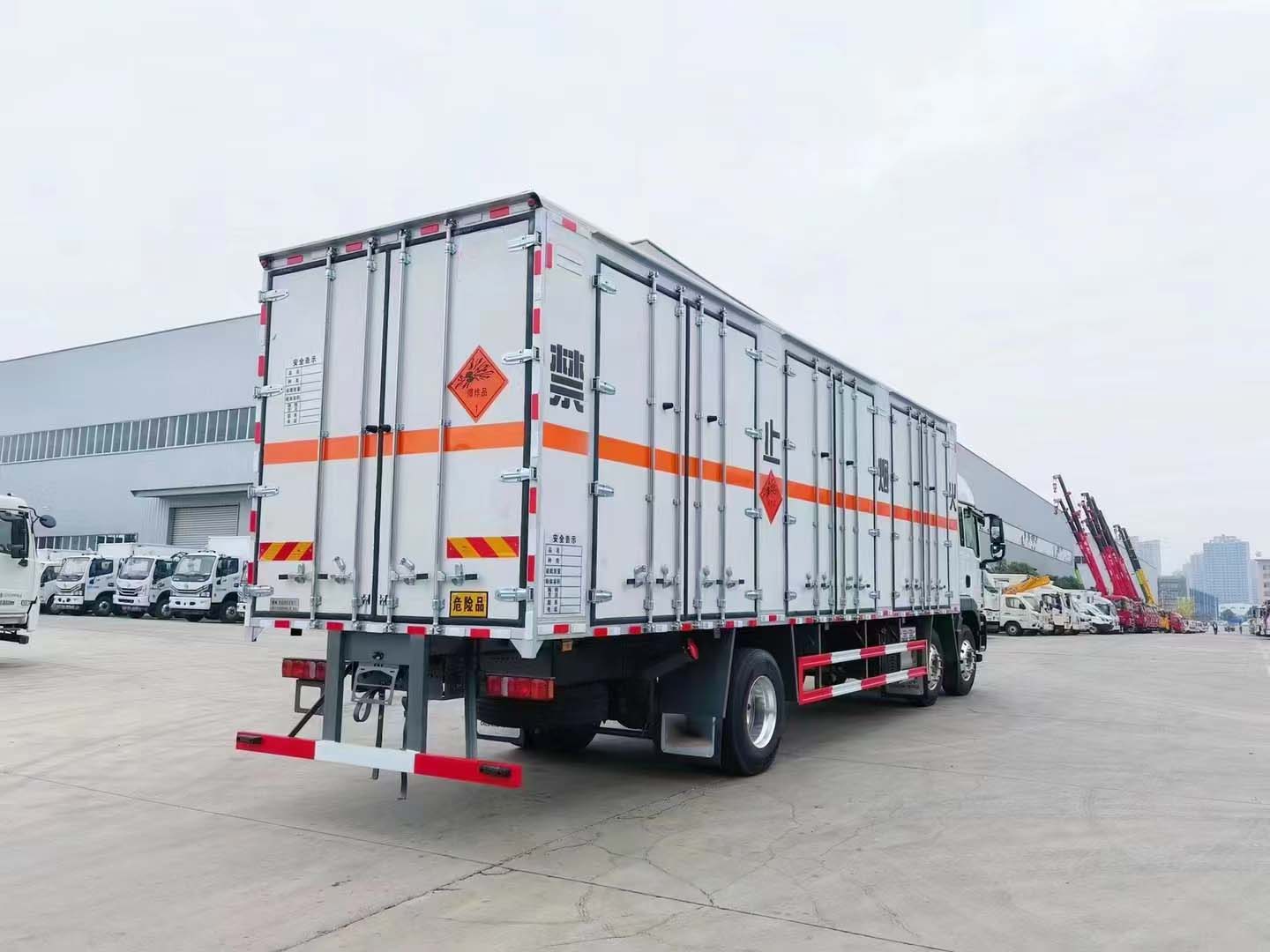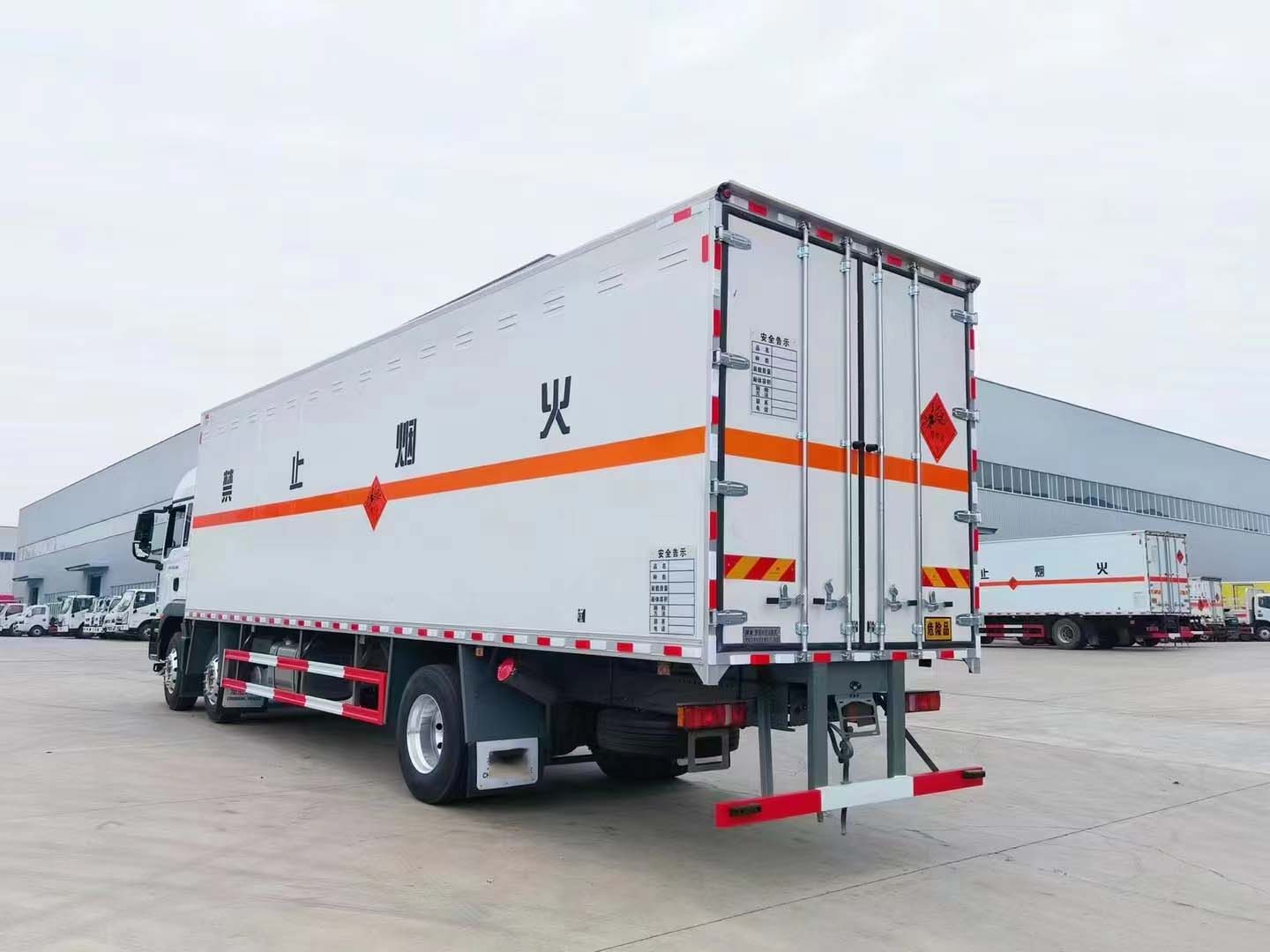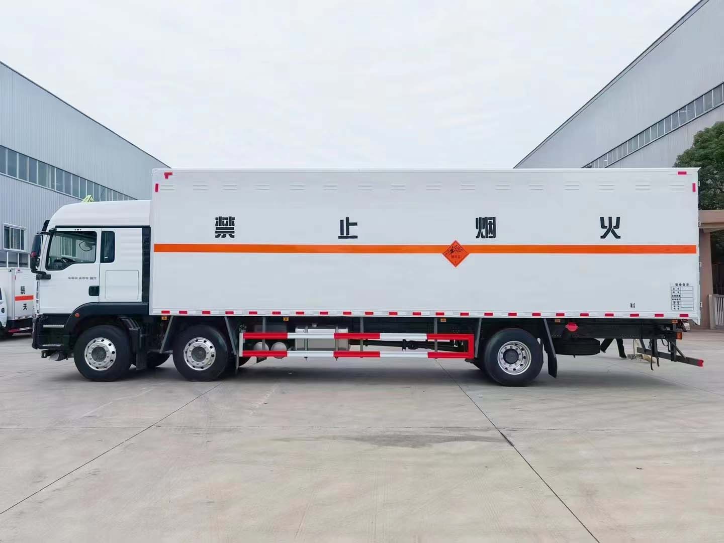 重汽汕德卡三軸高頂雙臥爆破器材運輸車采用的是汕德卡專用危險品車底盤,高頂雙臥駕駛室,德國曼MC07.25-60發動機,全車鋁合金輪轂,300L油箱。箱體尺寸9600*2450*2500mm。該車重點是車型配置高,變速器采用雙中間軸斜齒設計,副箱采用行星減速結構,承載能力強。頭擋速比為12.96,尾擋為超速擋,速比0.83。同時,車輛的1、2橋車輪均為鋁合金輪圈,并匹配盤式制動器,相比鼓剎,盤剎的制動力更加線性,提高了安全性和舒適性。295/80R22.5輪胎;400L油箱;LDWS+FCWS;中國重汽智能通B版;電磁式電源開關;終端排放監控裝置;轉向輪爆胎應急裝置;165AH蓄電池。都說我的草原我的馬,買車就買汕德卡,真正的品質讓您使用車輛更省心!