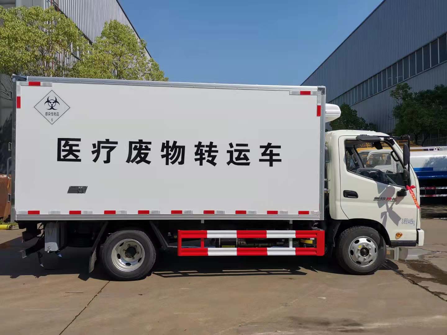 福田奧鈴藍牌醫療廢物轉運車選用福田二類危險品車底盤,國 6 排放標準,危險品原裝底盤(盤式制動,帶 ABS,限速,排氣筒前置,限速 80 kw/h),駕駛室顏色“白色”,可翻轉。軸距 3360 ,Q23-132E60 (132馬力),排量 2300 功率 85,變速箱 5G32-5 檔,駕駛室寬度 1695mm , 行駛記錄儀 MP3,排氣制動 ABS 限 速裝置,后橋 BJ130-3.5T 速比 4.875,動力轉向斷氣剎。帶雙預警,中控。