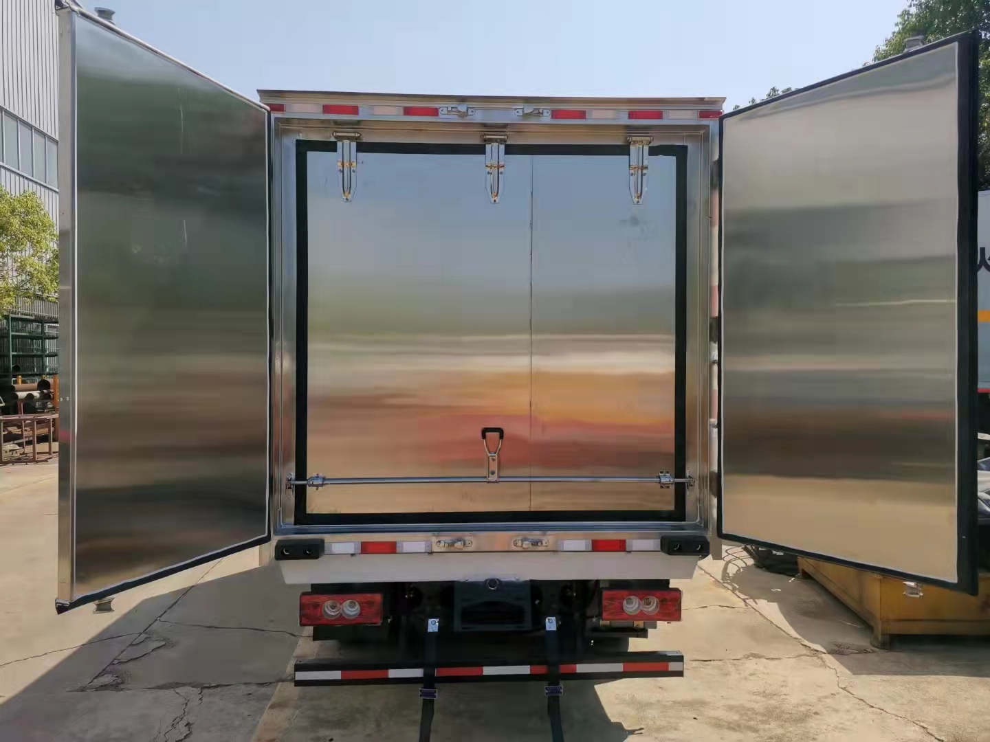 福田奧鈴藍牌醫療廢物轉運車外形尺寸:5995×2030×2840mm,貨廂尺寸:4120×1860×1750mm。廂體外玻璃鋼內不銹鋼,中間填充高密度保溫材料,后門為雙層密閉結構,后門對開,內門向上開啟。不銹鋼門框及其門件,迷宮式封條,使車廂完全封閉。廂內安裝紫外線消毒燈,加裝消毒噴霧器。醫療廢物轉運車采用帶有“醫療廢物”標識。廂體外部四周鋁合金包邊及包角,安裝-5度制冷機組,靜電接地帶,危險品三角燈,防火罩附件齊全。