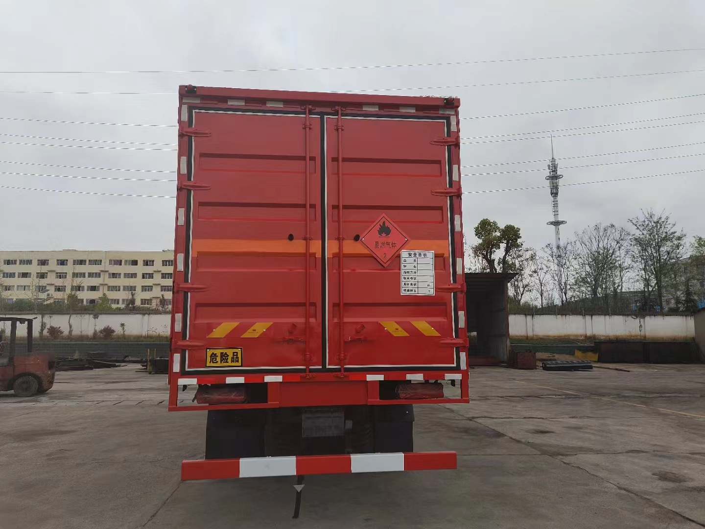 東風D3V國六三軸紅色危險品車采用的是D3V平頂駕駛室(DFCV天錦駕駛室車身), 康機B6.2NS6B260國六發動機,法士特9檔,6噸雙前橋,10噸后橋,295/80R22.5  18PR輪胎,鋁400L油箱,帶空調,氣廊座椅,電動玻璃,中控鎖,前盤限速,行駛記錄儀,后橋空懸,危險警示燈。帶EBS(電空制動系統),TPMS(前軸單臺胎壓監測),ESC(防側翻系統),AEBS(主動剎車系統)。