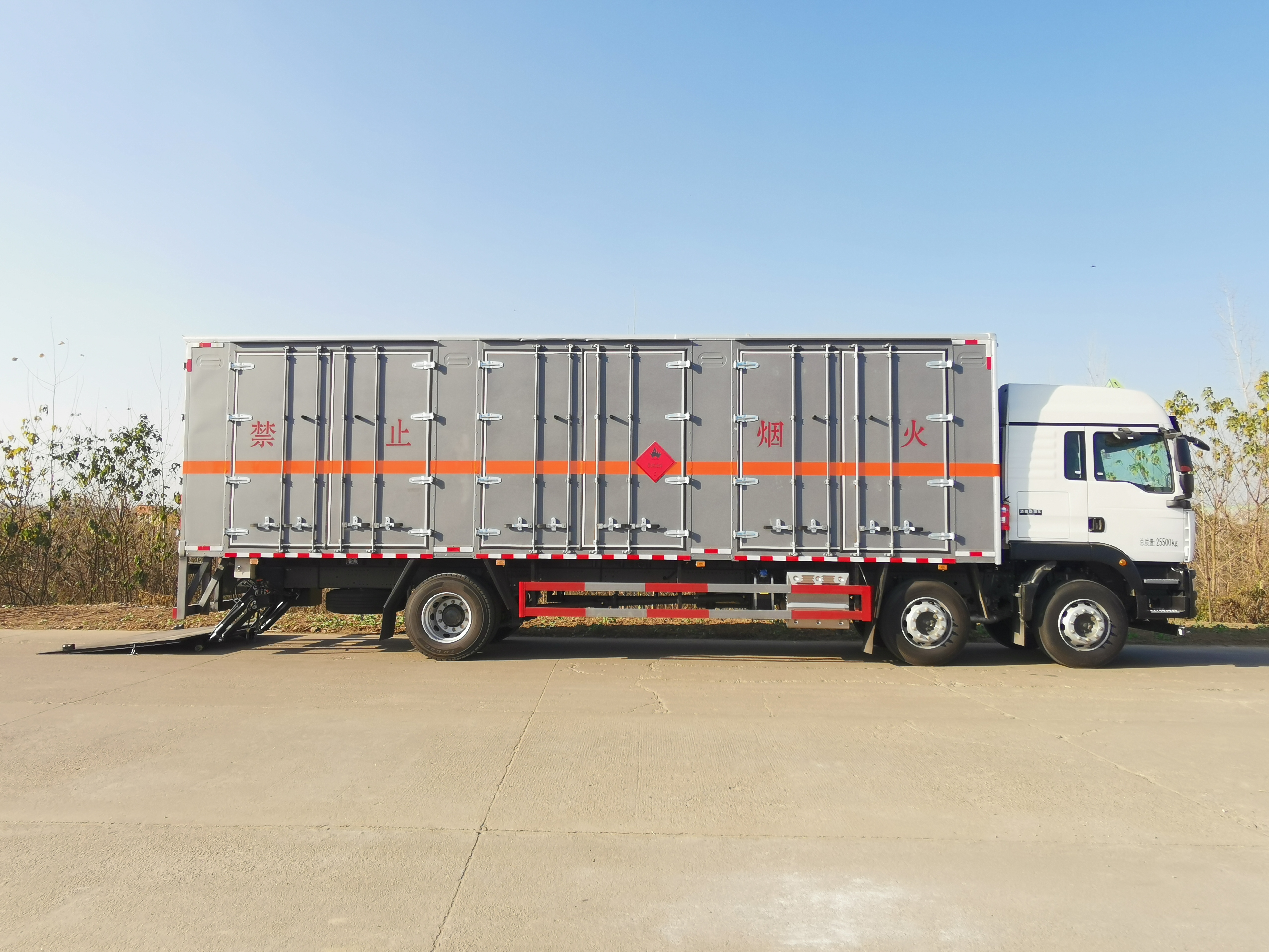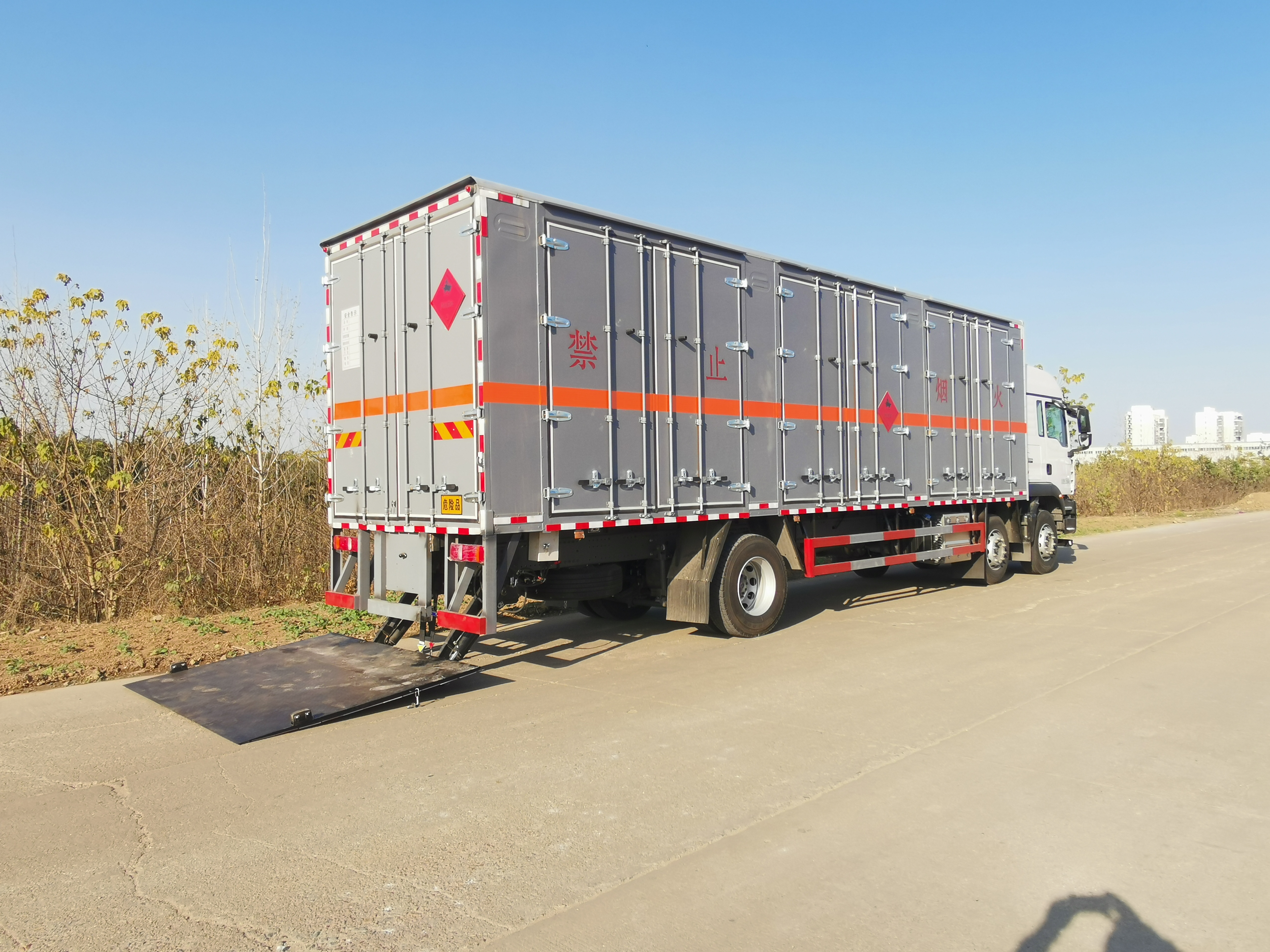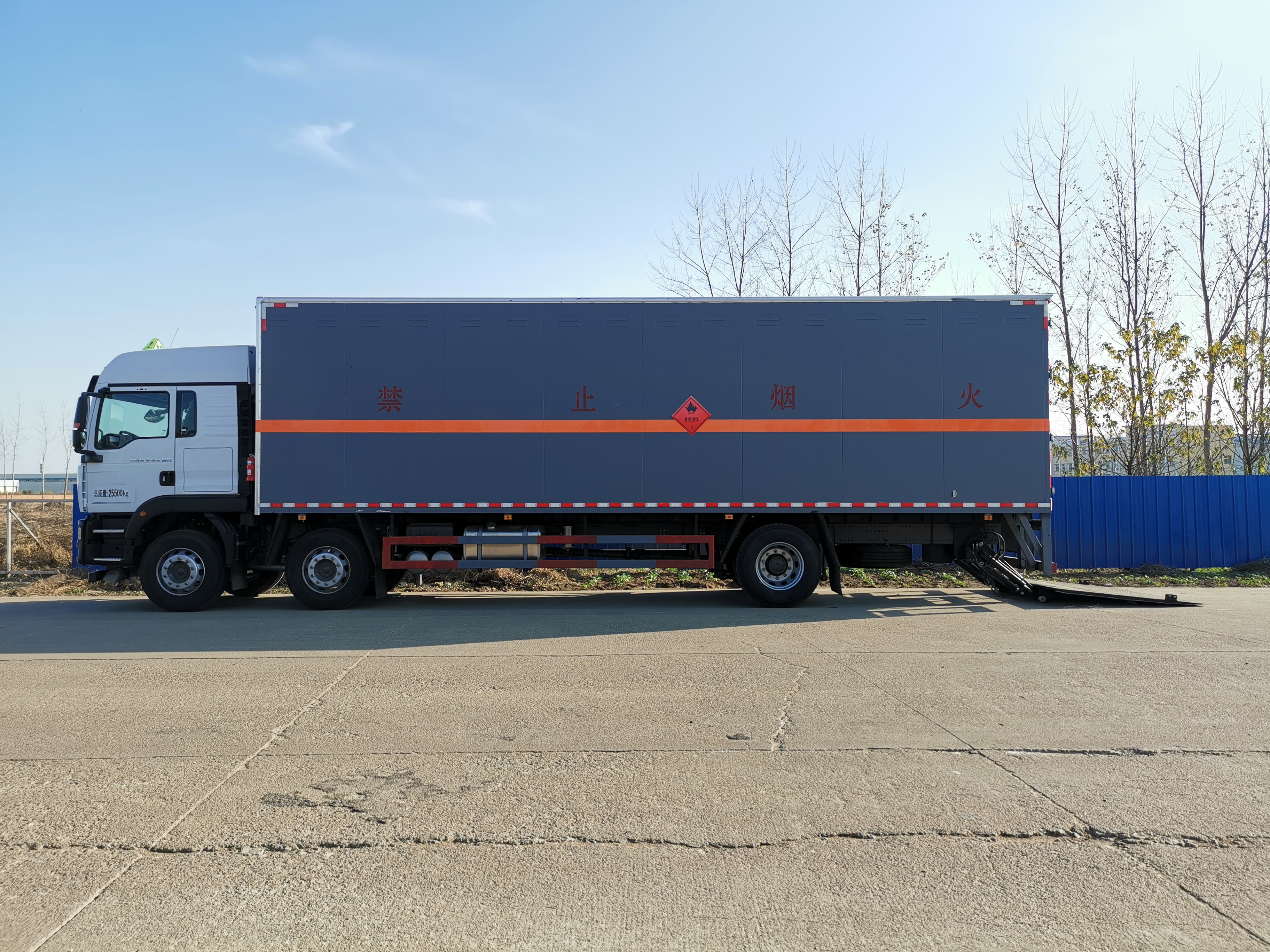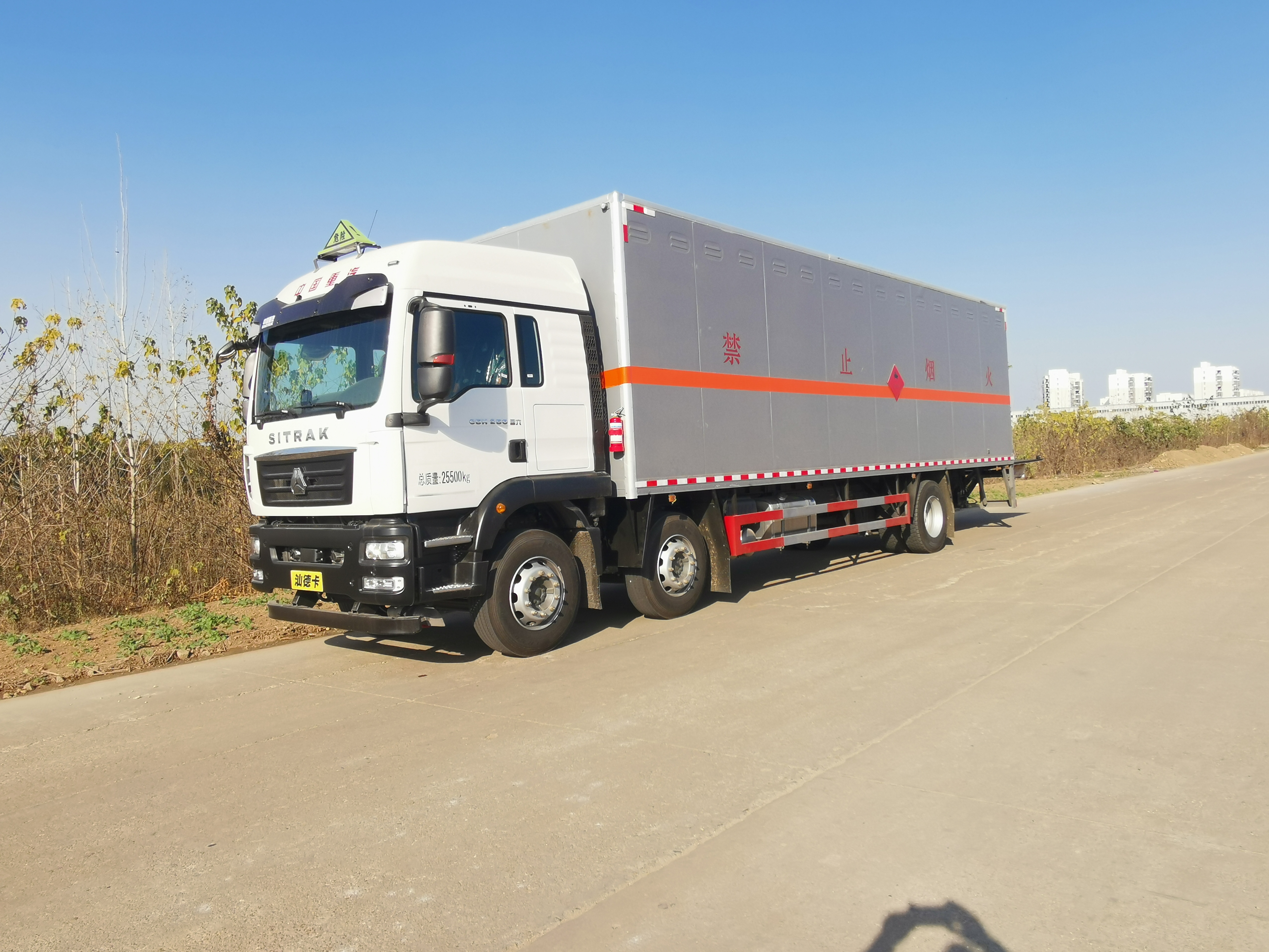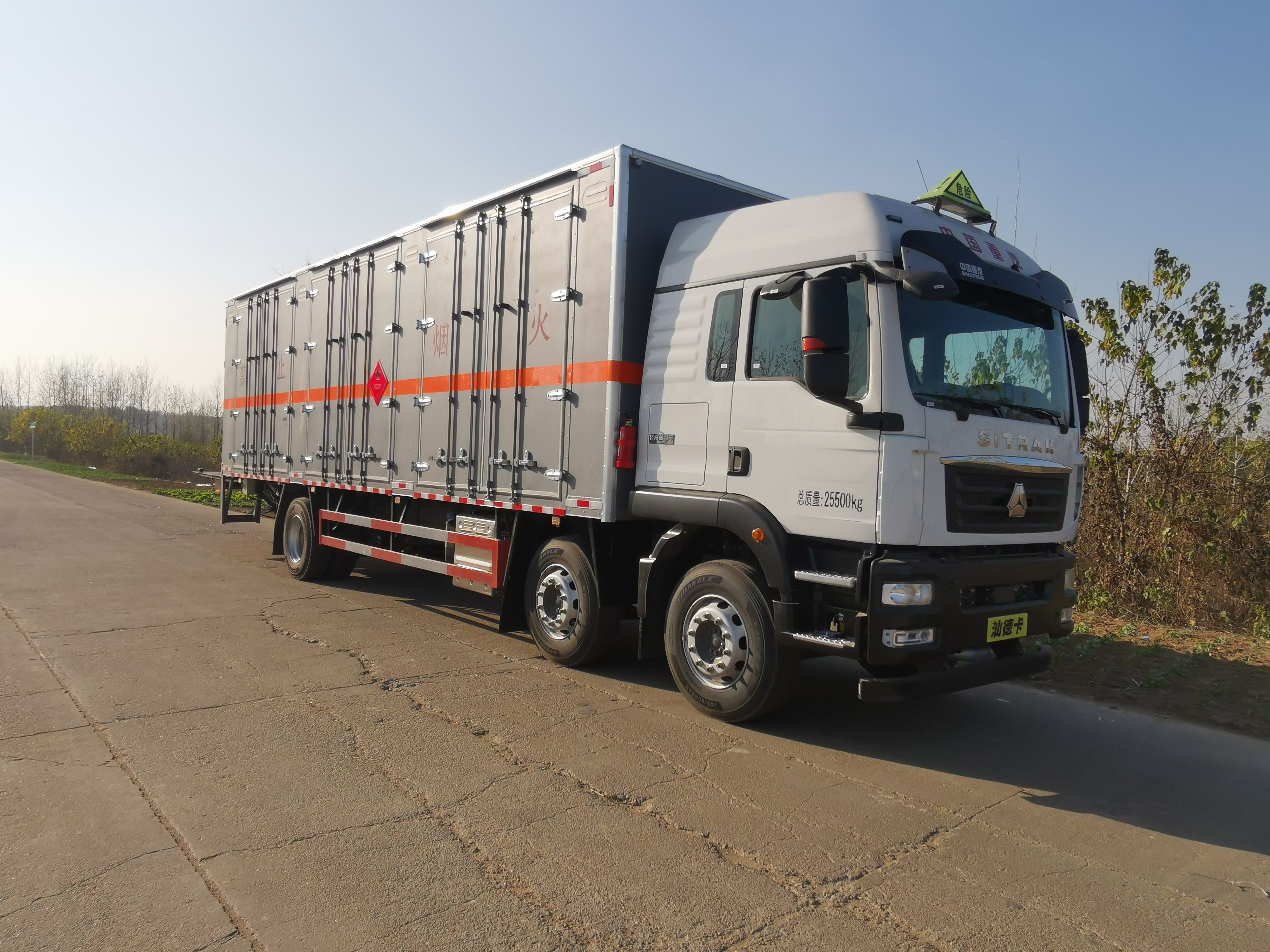 重汽汕德卡三軸煙花爆竹專用車運輸車采用的是G5-U雙臥駕駛室(長途運輸,司機駕乘便于休息)。國六排放標準滿足新規要求,營運環保都達標,上戶輕松無憂。該車匹配的是250馬力發動機和310馬力發動機,均可選擇定制。貨箱尺寸:9500*2450*2500mm,額載可達10噸,3人座駕駛室,空間寬敞駕駛舒適。采用的HW95508STCL變速箱(品牌性能穩定,安全性高);VPD050QB前軸(盤);MCY11BGS自調臂單后橋(鼓);速比4.63;多功能方向盤;電動電加熱后視鏡;雙層車架(8+4/280);前少后空氣懸架(3/3/-);博世方向機;限速79km/h;前置排氣系統;AEBS(EBS+ESC);高位保險杠(全金屬);295/80R22.5;300L油箱;LDWS+FCWS(帶雷達);中國重汽智能通B版;電磁式電源開關;終端排放監控裝置;轉向輪爆胎應急裝置;165AH蓄電池;胎壓監測系統;ZZ1266N56CGF1K/1800+5600mm。