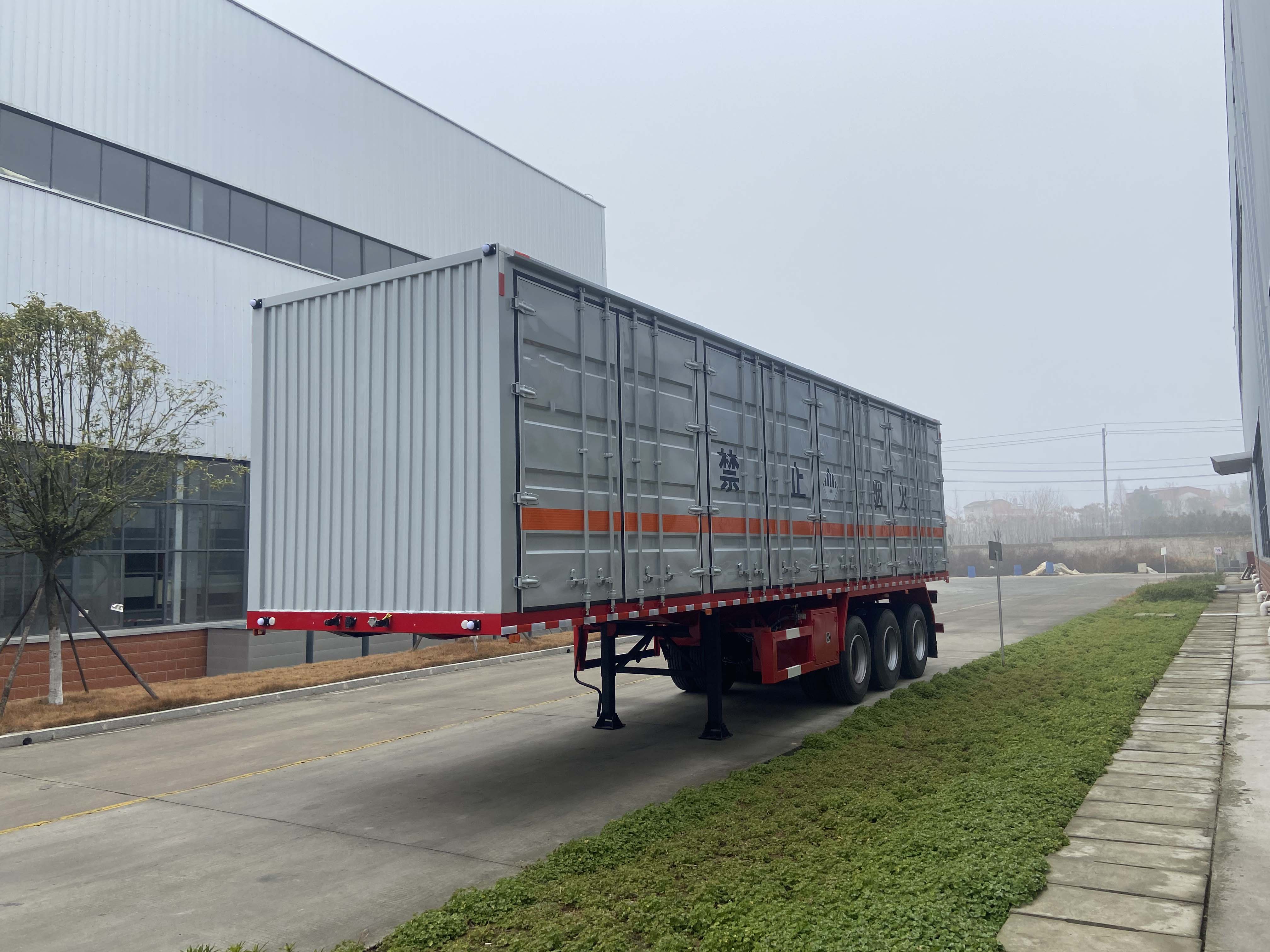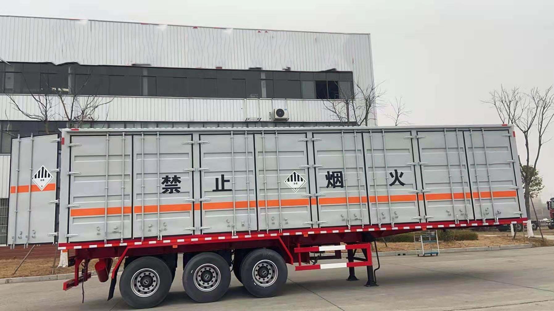 長途運輸裝載量,不能少的是一個車更方便更快捷地進行運輸。此時會用到的是左右開門更方便的半掛危險品車。該車采用的是氣囊減震橋。10噸富華盤式車軸,帶空氣懸掛,兩軸EBS,塑料樣式防飛濺擋泥板, 12條12R22.5真空胎帶普通鋼圈,50#牽引銷,28噸聯動支腿,一個工具箱,一個備胎架,箱體采用的是我司阻燃材料,為了方便裝貨,采用的是左右開門。側門全開的形式,裝貨更方便。貨箱采用的是免漆鋼板一次性沖壓成型的百葉窗,內飾為導電性能良好的合金板有透氣孔,內襯為矩形管骨架牢靠穩定,骨架內部填充為透氣防潮阻燃的擠塑板。廂體外部四周鋁合金型材包邊,底板和車廂前下部鋪橡膠皮,后門雙開,右側選裝側開門,內部安裝固定貨物的臥環或腰欄,安裝煙霧報警器、防盜感應器。車身附件靜電接地帶、滅火器、防火罩、危險品三角燈、橙色反光帶、CCC反射板。