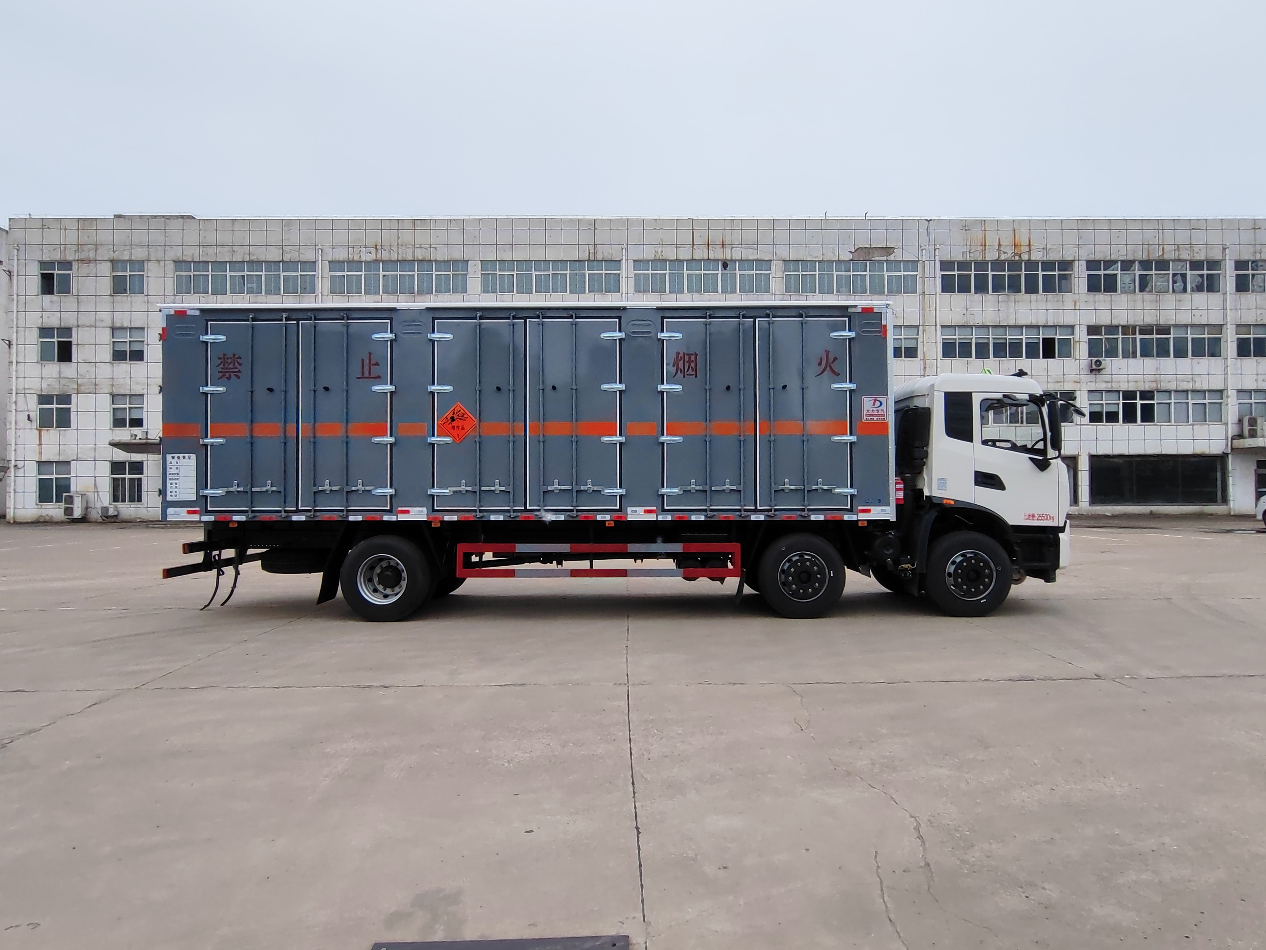東風天錦三軸9米6帶左右開門危險品車采用的是我司專用的天錦危險品車底盤,可選245馬力或260馬力發動機,匹配有高頂雙臥和平頂駕駛室,該類車型專車專用,為了裝貨方便,選用左右開門的形式。帶中控鎖、電動門窗、原廠空調。箱體采用的是我司加粗鎖桿,底板選用的是加厚型底板,橫梁間距為25mm,主體尺寸為9米6,可開3個3米的側門,車主不用擔心叉車臂進不去裝貨的問題。