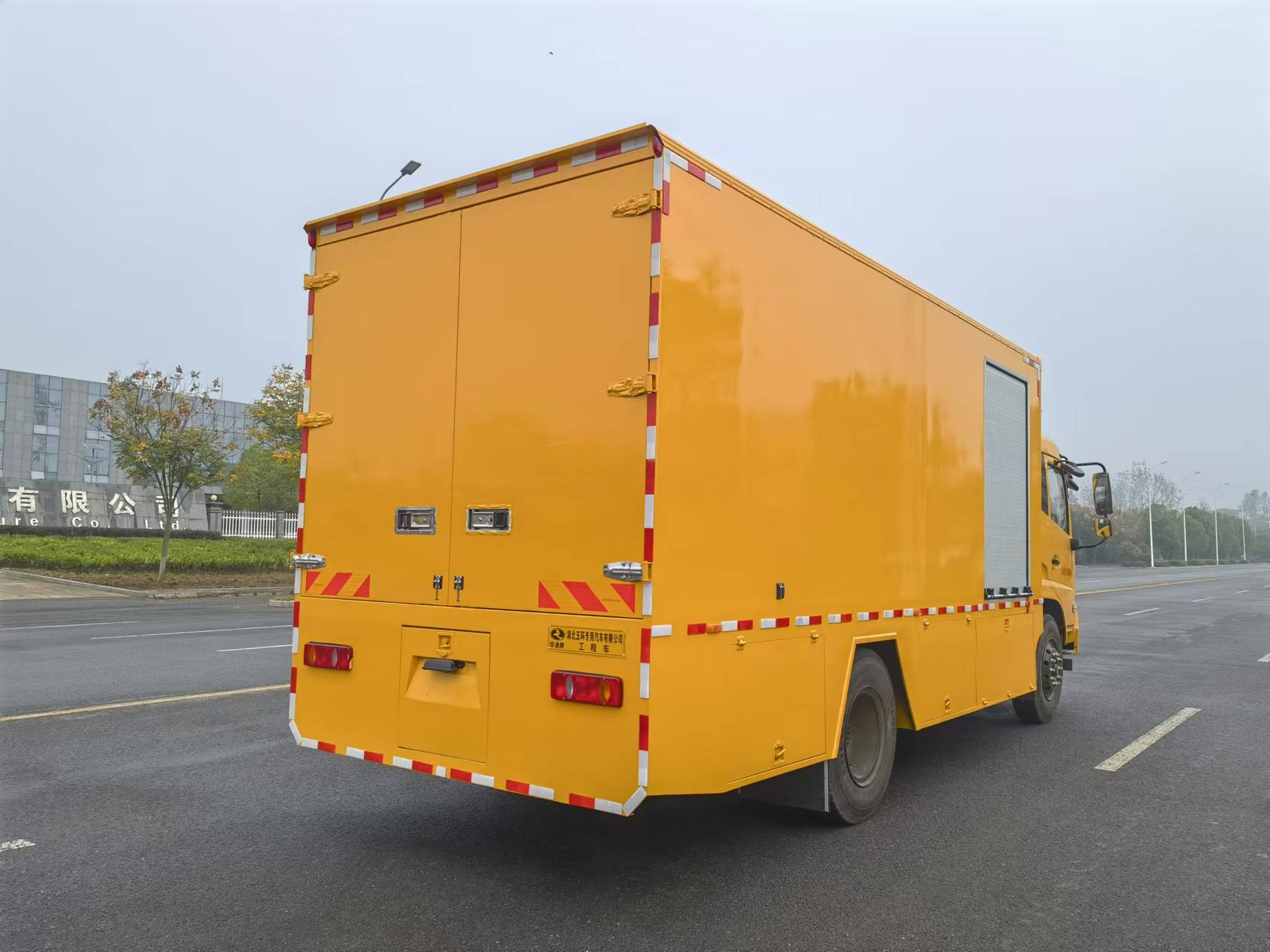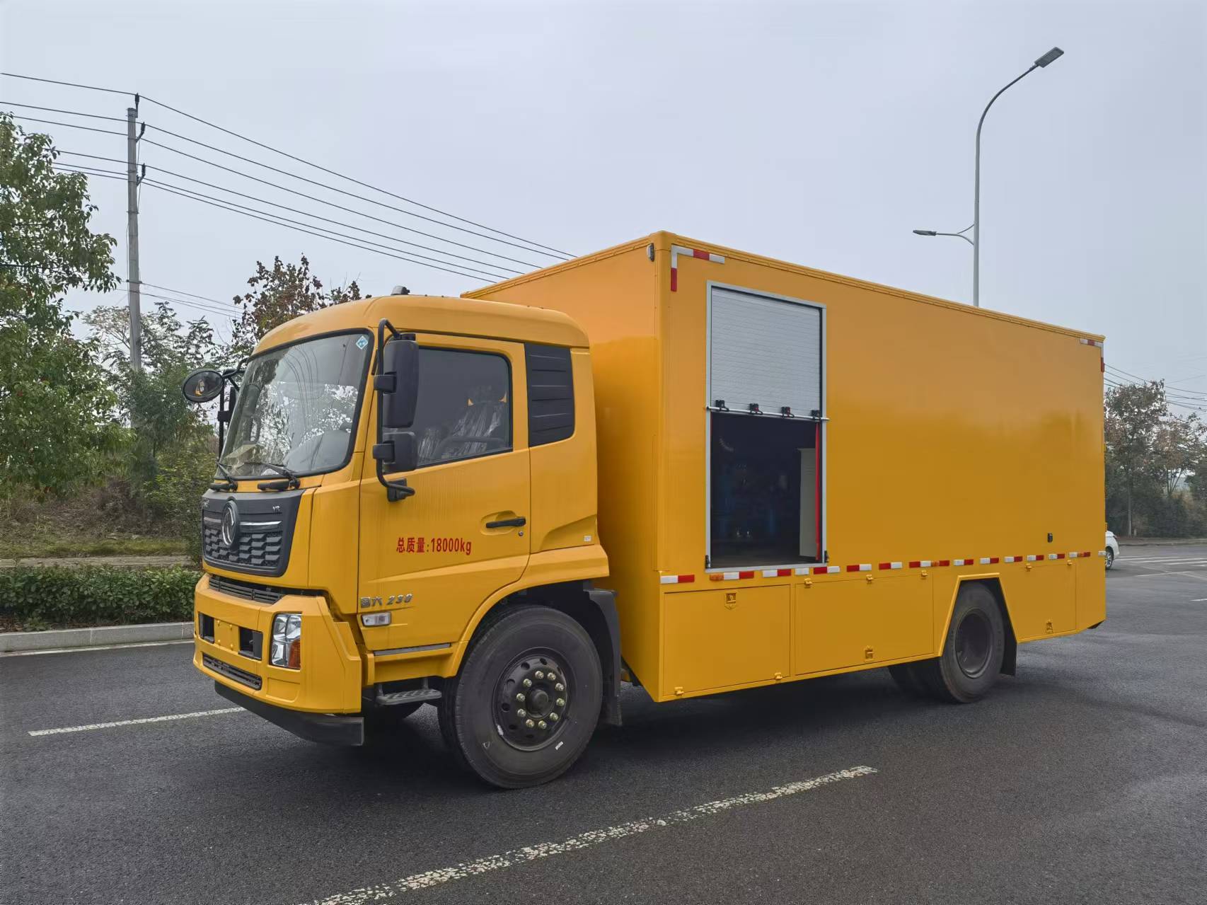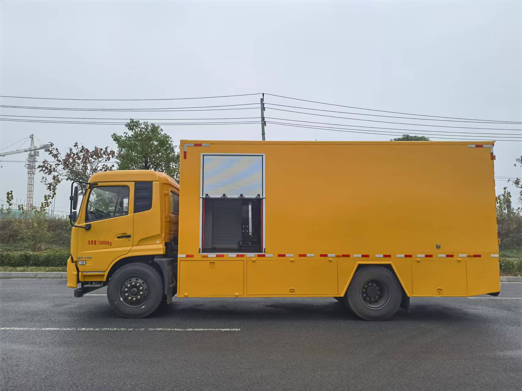 東風天錦國六工程車選用的是4×2工程車專用底盤,康明斯六缸230馬力國六排放發動機,法士特八檔(帶高低檔)變速箱,10.00R20鋼絲胎。采用密閉式方艙箱體,單側各配備3個卷簾門,尾部一個卷簾門,合計共7個卷簾門。配45KW發電機(帶水套加熱器,冬季冷啟動加熱)及相應取力變速器、控制系統、7.5KW空壓機組。內置油氣分離器廢油罐、歐版真空泵、進口1寸工業卷管器、真空廢油收集器。按鍵加遙控控制,過壓自動停機保護、廢油液位監控保護等。液壓油加注系統2套:進口齒輪泵、1寸卷管器等(根據實際需求,帶配套的裝油容器)。稀油加注系統(機油、齒輪油加注系統)2套:進口齒輪泵、1/2卷管器、進口流量計\進口數顯加注槍等(根據實際需求,帶配套的裝油容器)。潤滑脂加注系統2套:德國氣動加注泵(55:1),1/2重型工業卷管器、加注槍及裝油容器等。防凍液加注系統1套:帶15米卷管器、加注槍及裝液容器。