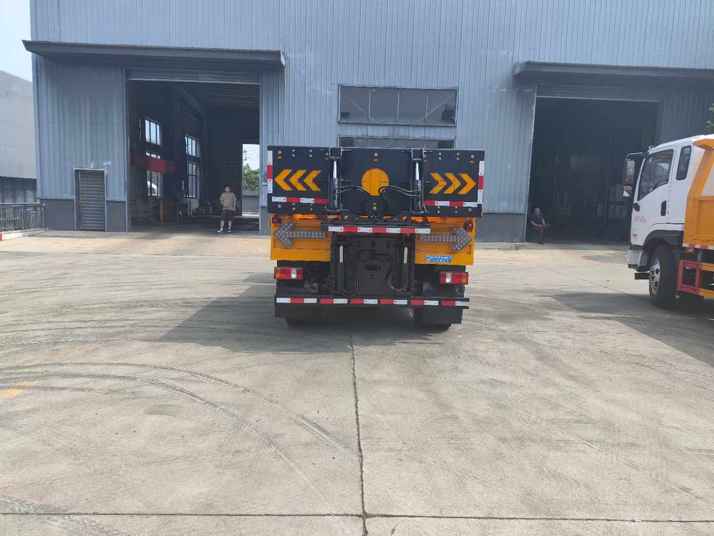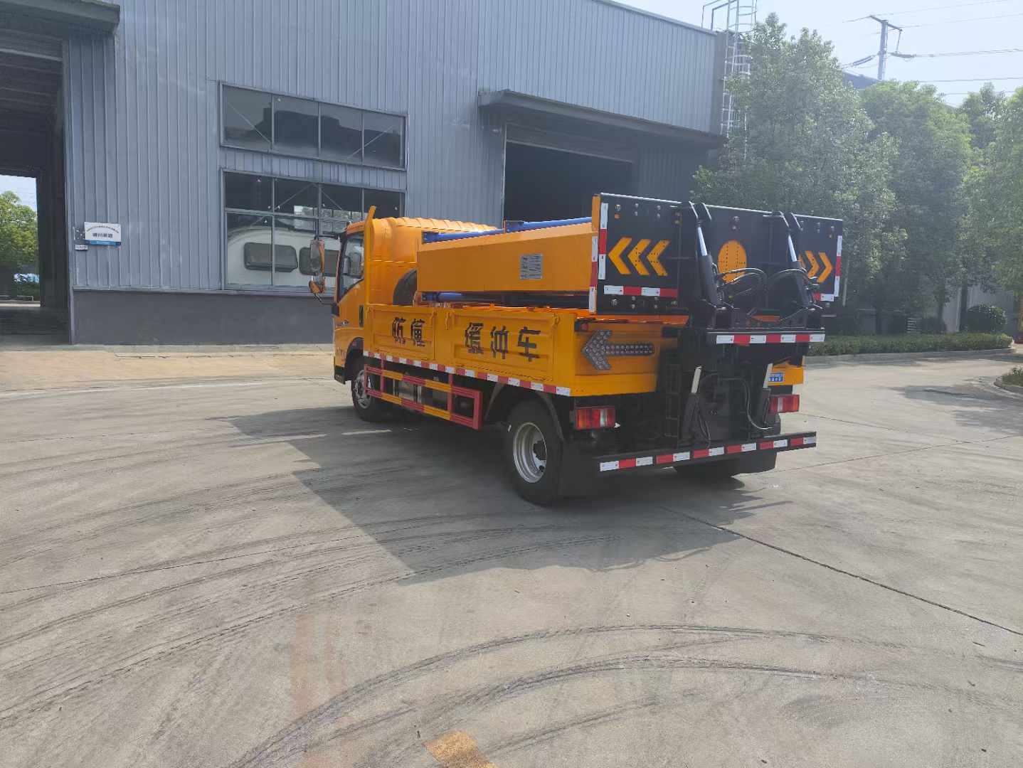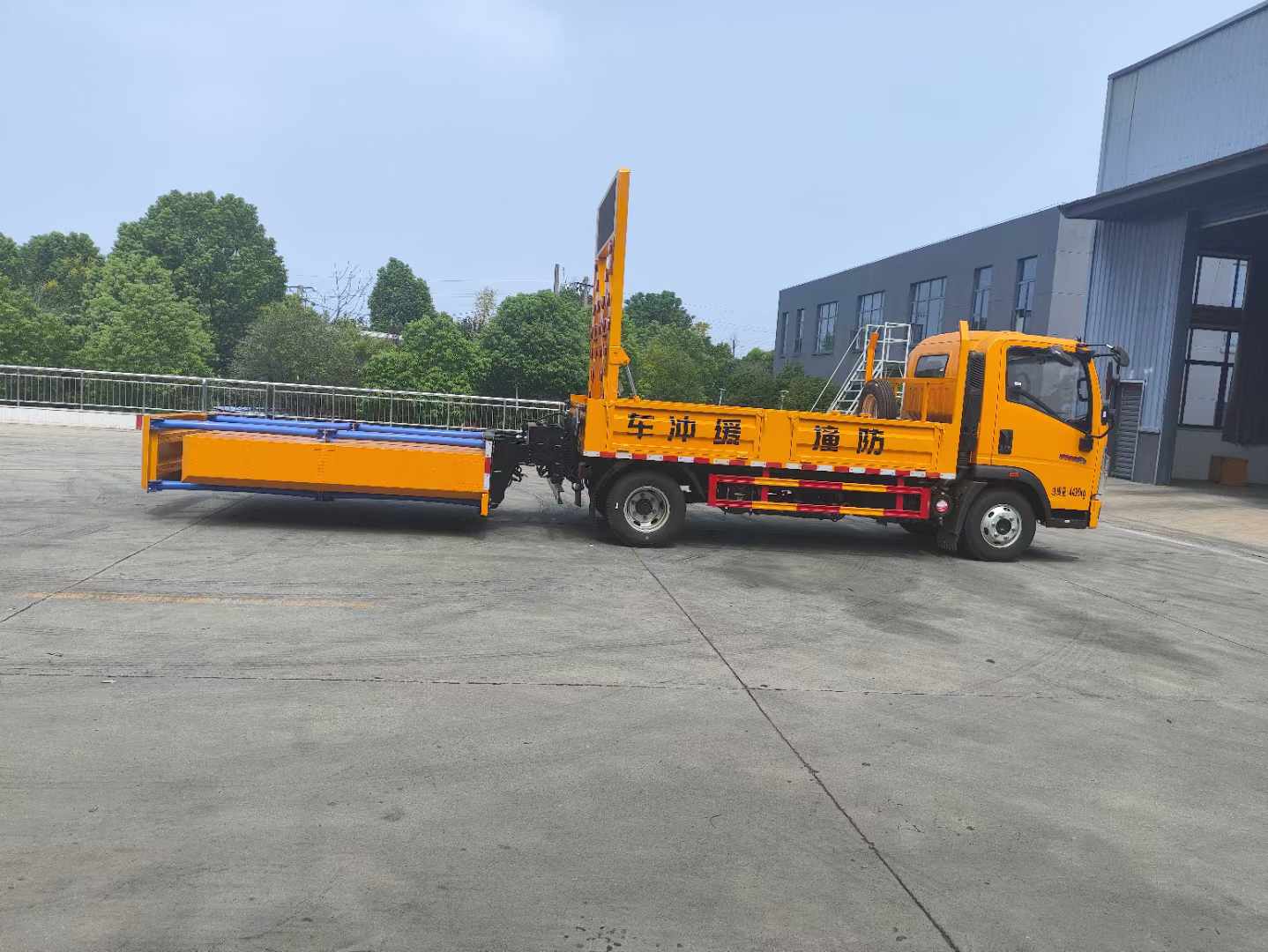 重汽藍牌100K國六防撞緩沖車選用的是加長型軸距(3600mm);帶動轉,匹配有空氣懸架,帶原廠空調、排氣制動,120L鋁合金油箱、帶ABS+ASR(含ASR開關)。貨箱采用 Q235 邊 3mm底板花紋板 4mm 厚,箱體后部防撞緩沖模塊包采用國際知名技術產品 100K 防撞緩 沖模塊,防撞緩沖吸能模塊主要由車載防撞緩沖墊和導向標志燈架,箭頭燈,高音喇叭,LED顯示屏組成。充當施工作業車輛后方的緩沖衛士。 如若發生追尾事故,能夠在肇事車輛和前方施工作業區域之間構建一個緩沖區域,通過機具結構變形吸收撞 擊的能量,最大限度地降低被保護人員及設備遭到碰撞的幾率。高性能液壓系統,可實現快速舉升和落下操 作,方便設備運輸轉場,一鍵啟動功能,舉升和落下防撞裝置,當防撞裝置未完全落下到工作位置或舉升到 垂直運輸位置時,會自動警告音提示。
