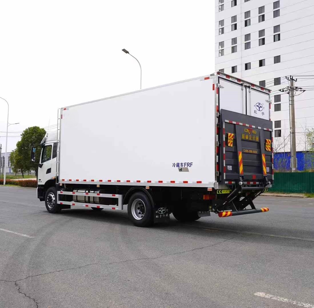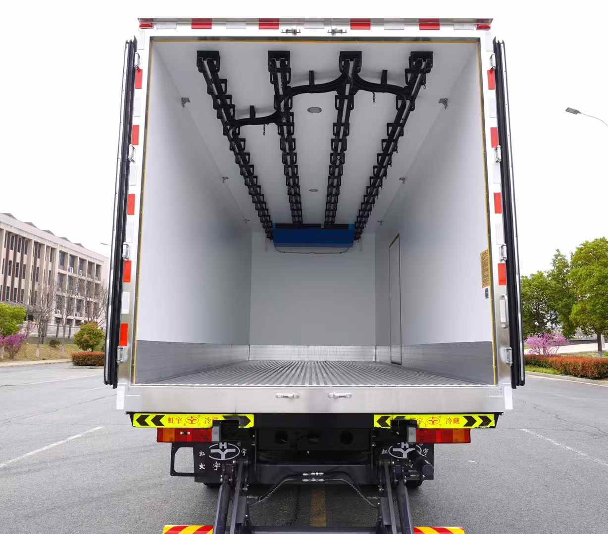 東風天錦KR國六法士特8檔冷藏車選用的是2025款D560KR高頂雙臥駕駛室,法士特8檔變速箱,駕駛室液壓電動翻轉(zhuǎn),帶空調(diào),可調(diào)節(jié)氣囊主座椅,多媒體大屏,多功能方向盤,前后攝像, 前/后橋4.5/9T,大梁220×75×7,板簧片數(shù)8/10+8,400L鋁油箱,速比3.64,275/80R22.5 18PR輪胎,140Ah蓄電池,2人座軸距:5000mm,整車型號:DFH5180XLCEX7,整車尺寸:9200*2600*3960(mm),箱體尺寸:6800*2440*2500(mm)。選用的是康明斯290馬力發(fā)動機,箱體選用的是內(nèi)外玻璃鋼,中間夾的保溫材質(zhì),根據(jù)運輸肉鉤的要求該車匹配的是肉鉤專用箱體,帶滑道。為了上平臺更方便,該車尾部可加裝液壓尾板,整車不超重。