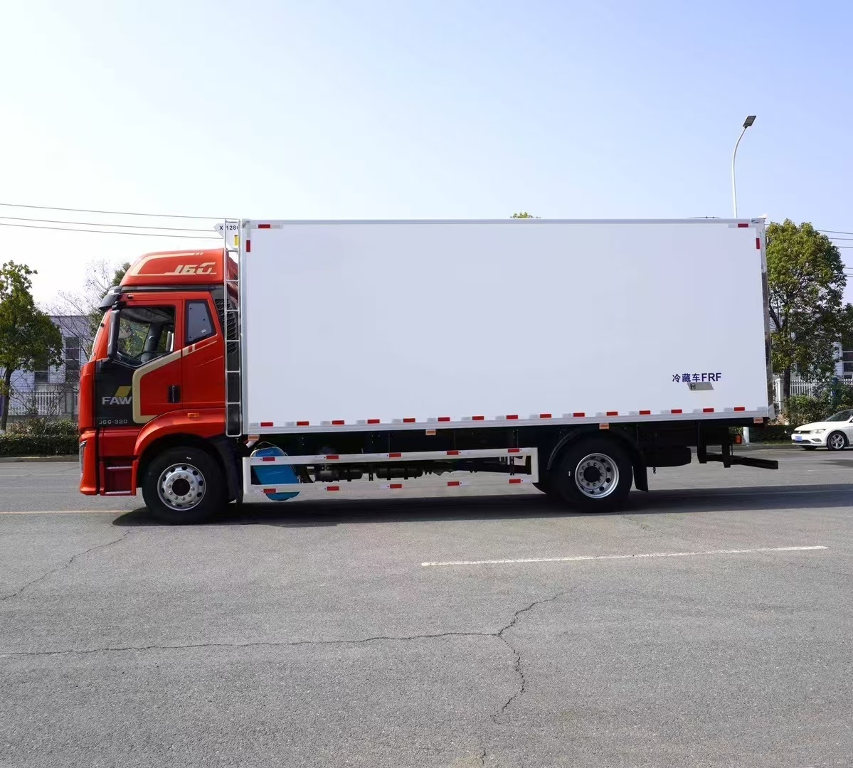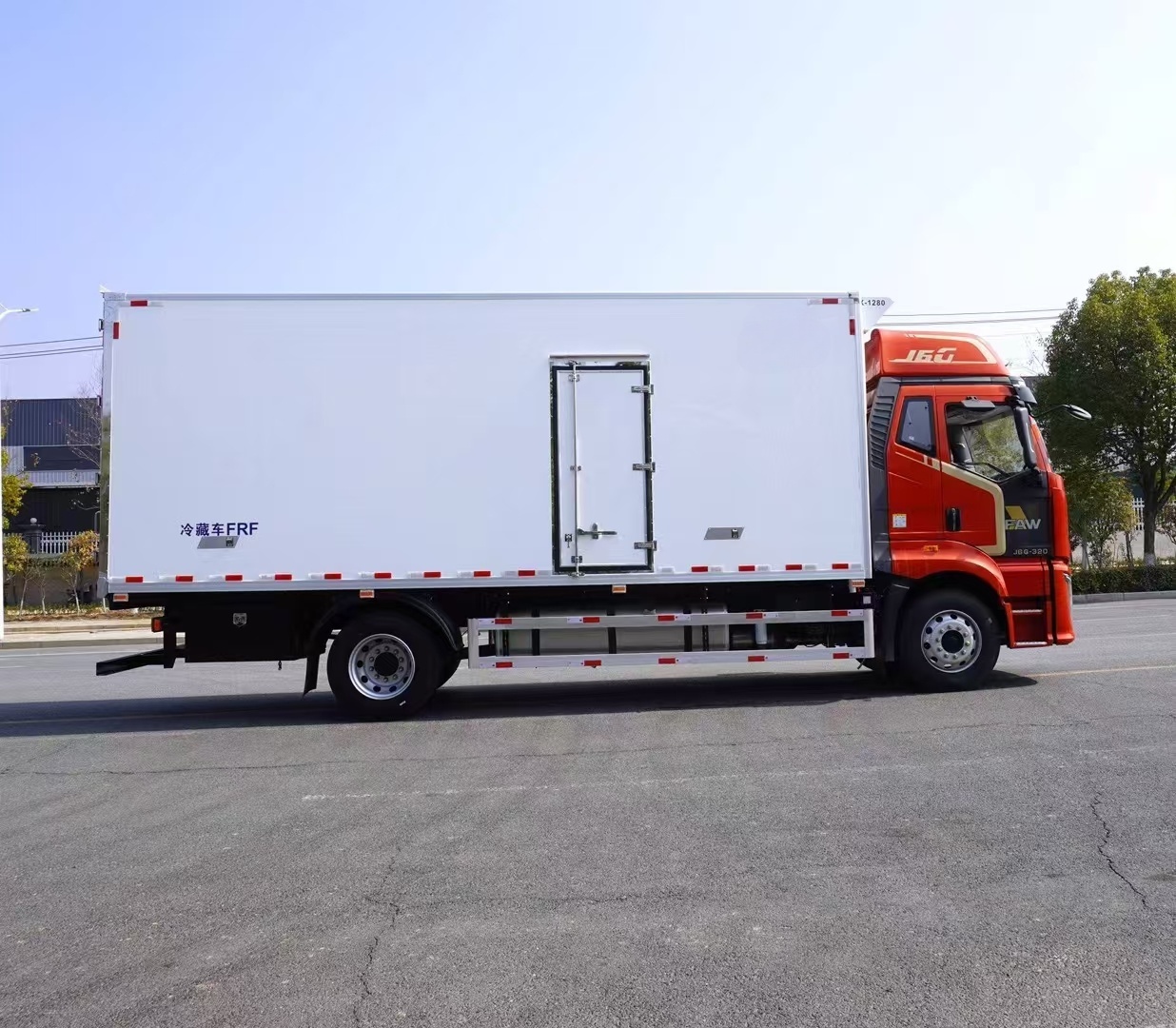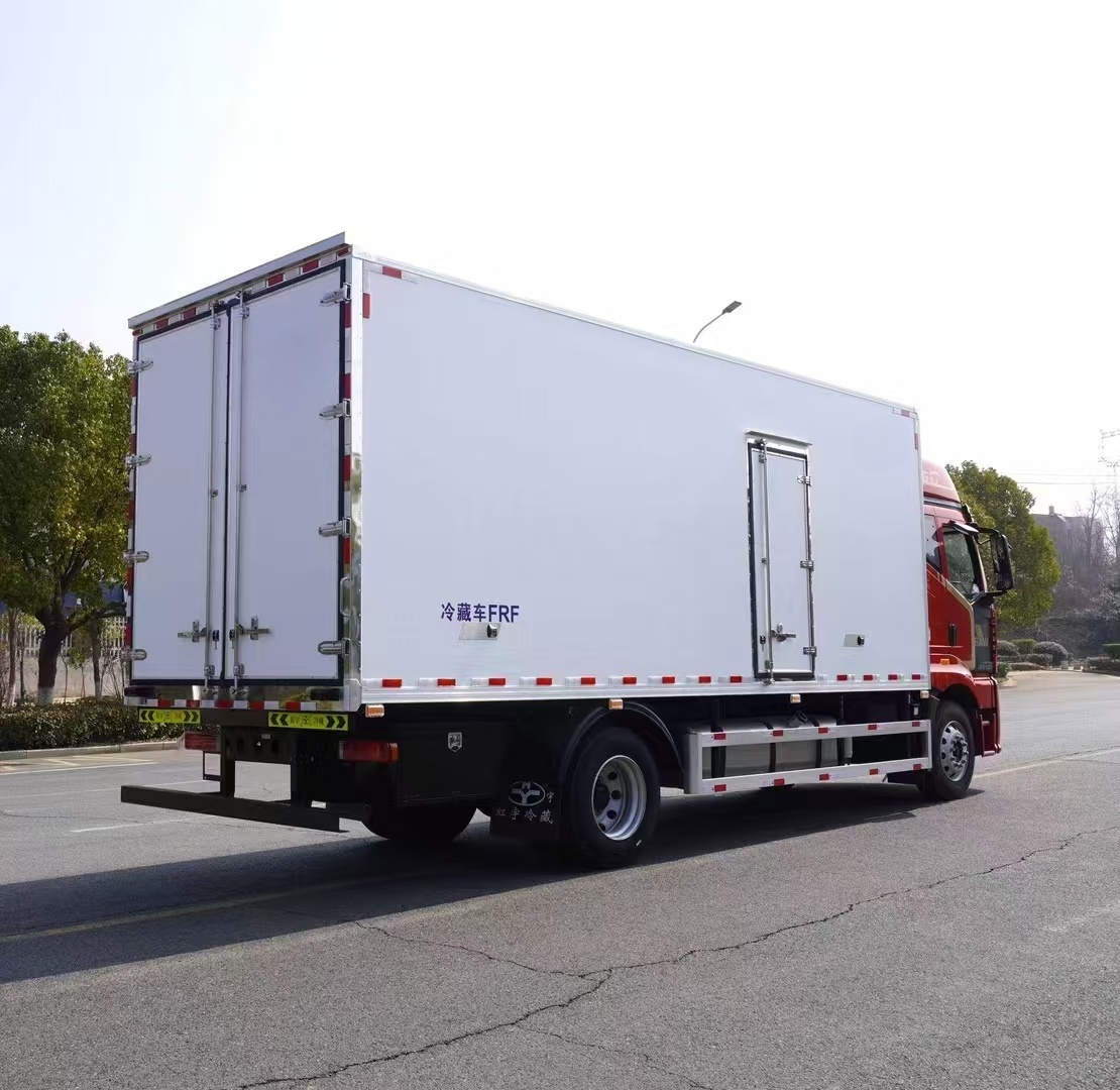 可配不同品牌制冷機。液壓尾板。整車型號:CA5181XLCP62K1L5E6,底盤型號:CA5181XXYP62K1L5E6,箱內尺寸:7700*2420*2570mm。