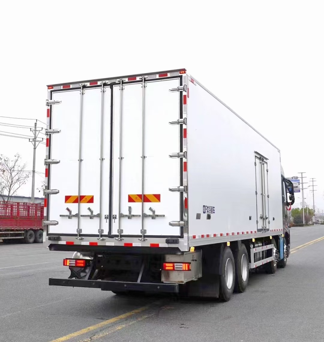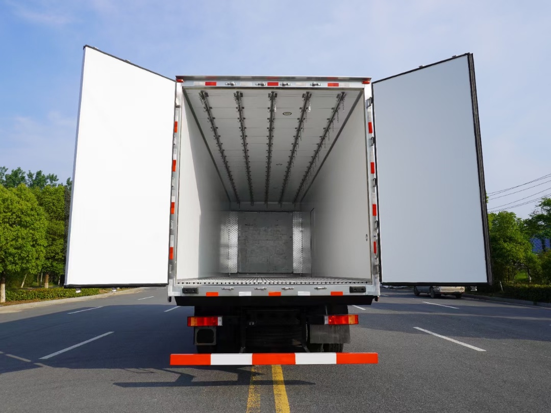 東風天龍9米6冷藏車箱體采用三明治符合粘接。保溫吸能好,重點是中間保溫層為擠塑板,底板采用的是鋁制花紋板,門框采用的是迷宮式的密封條,門邊帶有隔熱條。根據運輸要求,箱體可加裝制冷機組,加裝通風槽及多種側門開啟形式