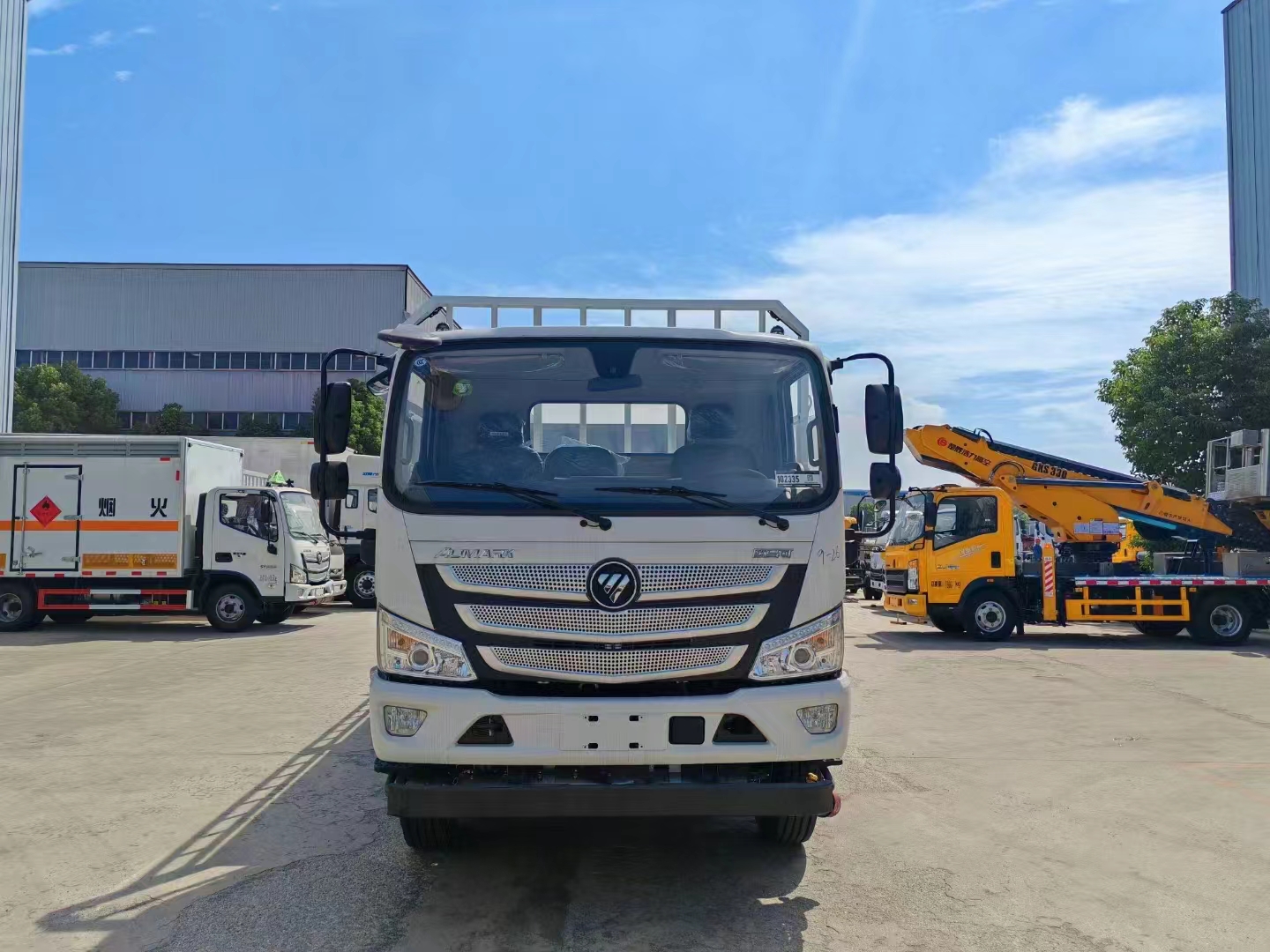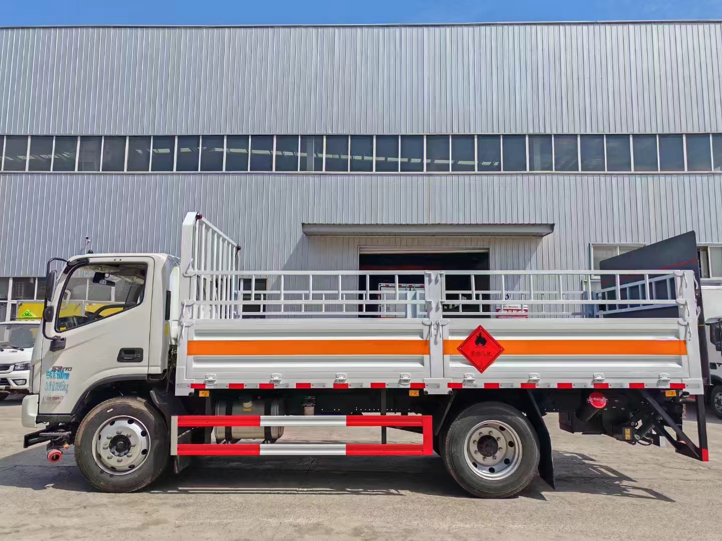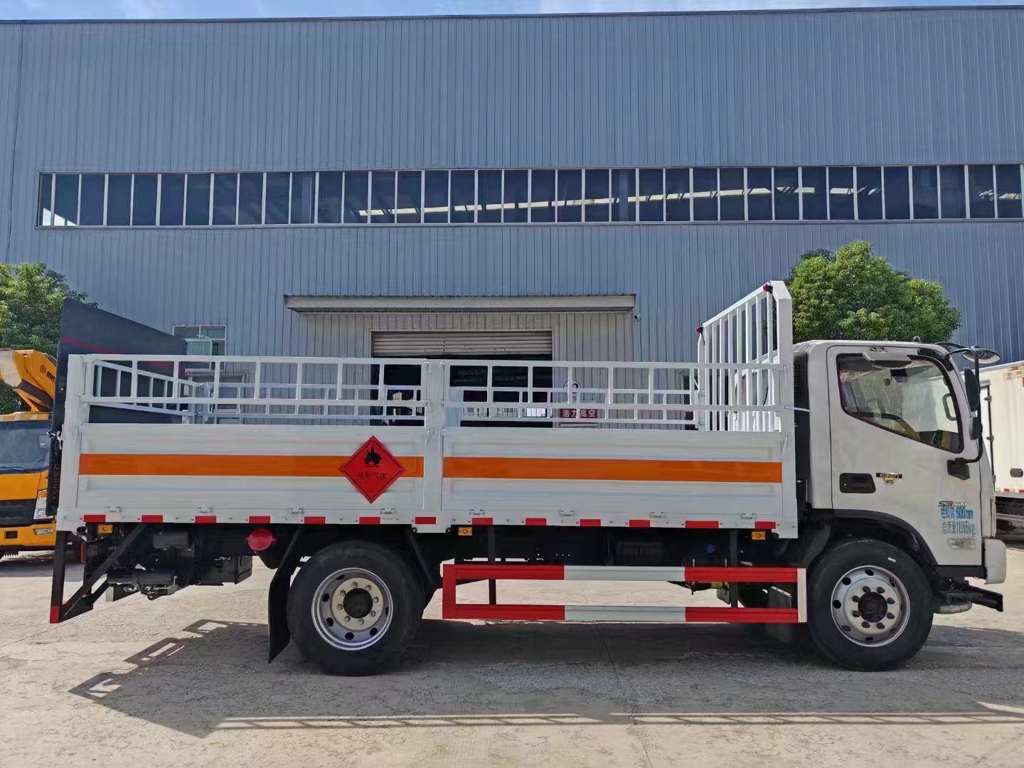 福田歐馬可國六5米1氣瓶車冷板等鋼材焊接而成的高欄結構,高欄活動可整體拆卸,兩側欄板下翻轉,后部欄板下翻轉,前龍門架齊全,鋪設防靜電膠皮,廂體橙色反光帶,紅白相間反光板,菱形標志牌,危險品牌,拖地靜電帶,安全告示,滅火器等
