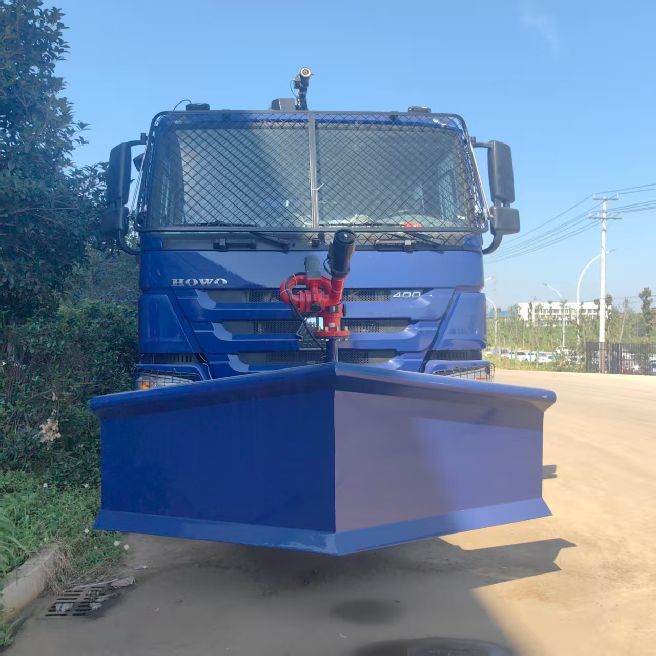 重汽豪沃避障維和治安車選用的是后雙橋底盤或者單橋底盤,可選多款發動機,該車用于維和治安,所以車輛所有涉及窗戶的地方全部采用的是防護網設計,車輛前部帶避障鏟,帶防爆消防水泵,可以進行水霧水噴灑,頂部帶高炮可灑泡沫或者辣椒水。采用的是遠程電動控制,所有管道全部采用的是不銹鋼控制。罐體容積可定制,根據高炮的設計定制有專用的管道。