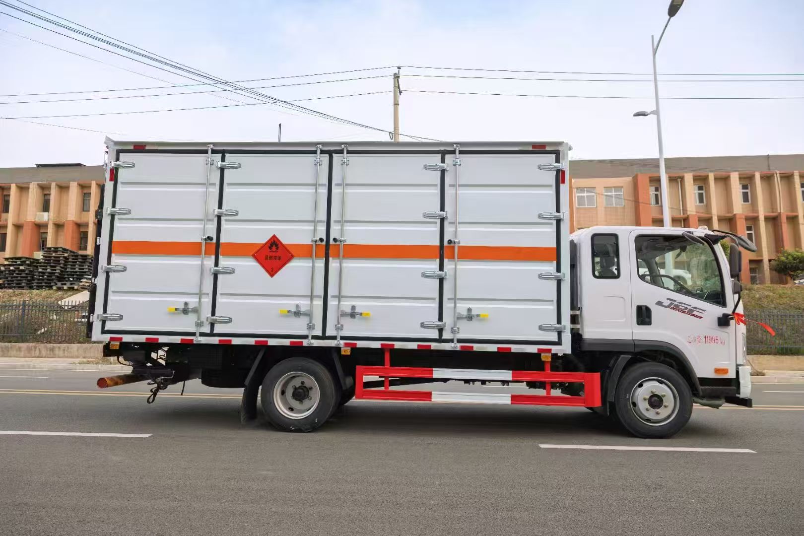 解放J6F帶全開門易燃液體廂式車采用的是危險品專用底盤,J6F(2010)單排駕駛室,大柴CA4DD2-18E6,陜齒8JS75C,325GH后橋(6噸后橋,16L尿素箱,帶國產ABS,液晶儀表,電加熱后視鏡,150L鋁合金油箱,板簧7/10+4,高架箱,空調+電動門窗+中控鎖,前后橫向穩定桿,后處理器前置+排氣火花熄滅器+前盤后鼓制動器+限速79KM/H+前碰撞預警+車道偏離輔助預警,北斗+GPRS行車記錄儀,帶靜電拖地帶,爆胎應急安全裝置,;瘜S玫妆P。整車尺寸 7100×2550×3270(mm),廂體尺寸 5200X2400x2100。額載噸位7噸,裝貨多不容易超載。采用瓦楞板箱體,底板為4mm花紋板上鋪防靜電膠皮,廂體右側全部開門。底部橫梁加密25左右,門框帶防盜報警器,頂部帶煙霧報警器。其他按標配制作,配備隨車工具。