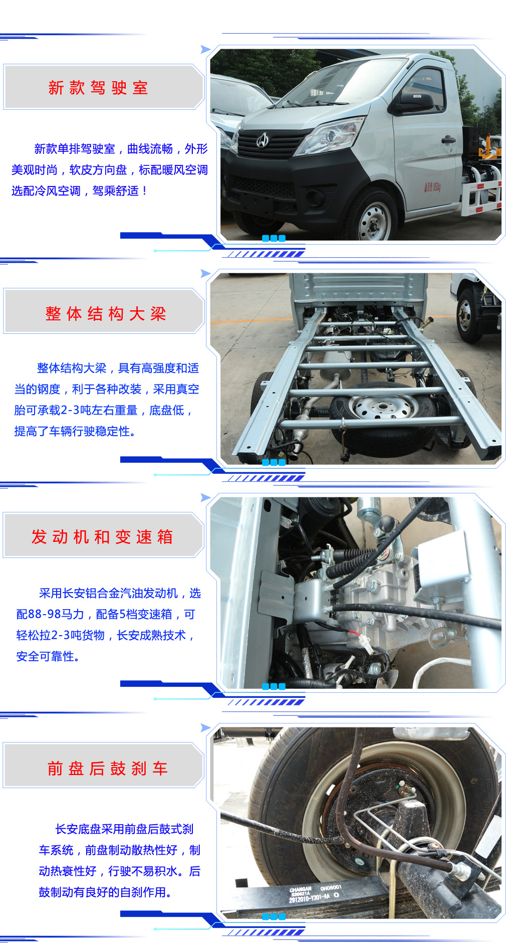 底盤配置:采用長安星卡系列底盤,加長軸距(2900mm),175/70R14輪胎子午胎配五片簧,長安98馬力發動機,五檔變速箱整車上藍牌,符合國家環保標準,可辦理營運證。