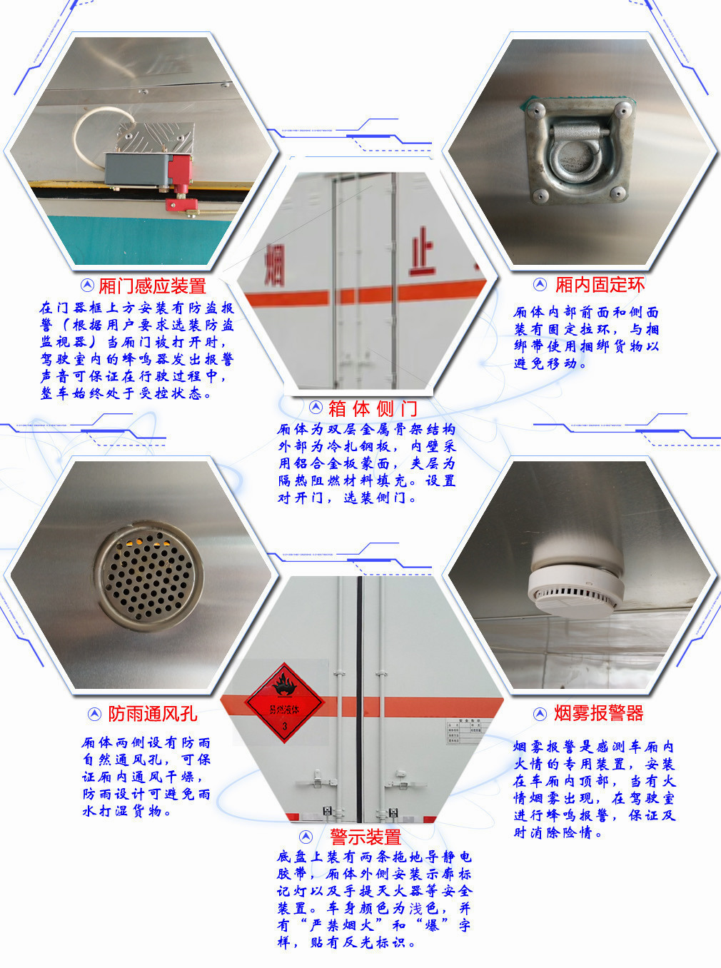 1、該車適用于運輸危險品,運輸具有獨立容器(瓶)包裝的物品。運送危險物品類項號:2.1,2.2。廂體頂部封閉,不可開啟。2、側、后防護材料為Q235,螺栓連接,后防護截面尺寸(mm)100×50,下邊緣離地高450mm。3、僅選用排氣管前置、限速裝置(限速80km/h)、前輪盤式制動及子午線輪胎的底盤,轉向輪安裝輪胎爆胎應急防護裝置。ABS系統控制器型號/生產企業: ABS-E/威伯科汽車控制系統(中國)有限公司,ABS-VIE/廣州瑞立科密汽車電子股份有限公司,ABS8.8 ECU 24V/東科克諾爾商用車制動系統(十堰)有限公司。發動機/油耗值(L/100km)對應關系為:CY4SK261/16.09,D30TCIF1/16.19,F2.8NS6B156/15.39,F3.8NS6B156/14.90。 |