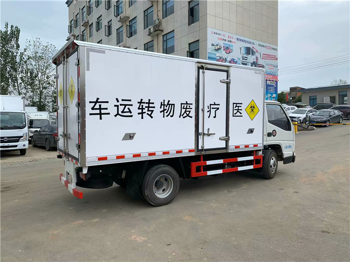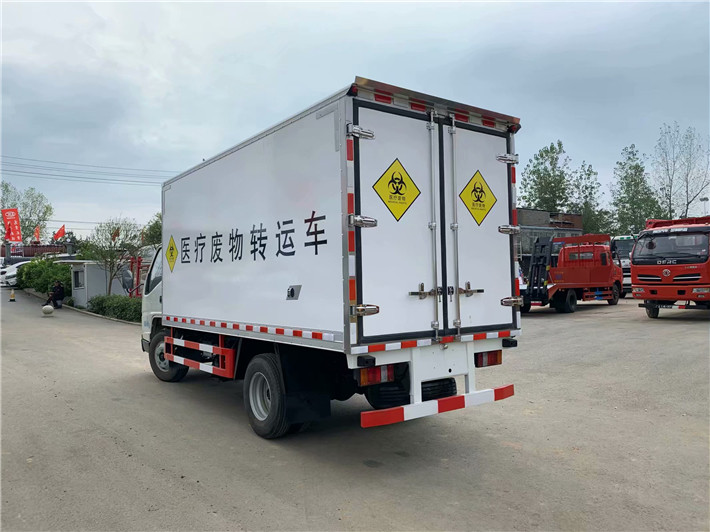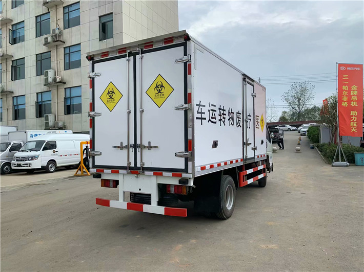 江鈴國六醫(yī)療廢物轉運車,箱體配置:箱體采用外玻璃鋼內不銹鋼材質制成,5cm保溫板,箱體內無死角,加裝噴霧消毒,紫外線滅菌燈,尾部為雙層密封門,防滲漏,污水收集箱,加裝-5度制冷機組。