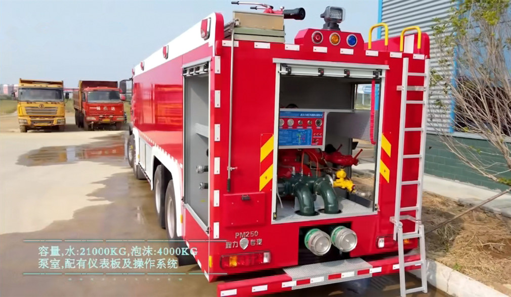 重汽豪沃前四后八國六水罐、泡沫消防車水泵設(shè)有Φ150mm進水口,可從天然水源、液罐、消防蓄水池 吸水,另可加轉(zhuǎn)換異徑接口連接消防栓吸水供水,吸水管放置于車頂。1 個 帶Φ150mm 蝶閥的進水口,用于與水罐相連接。車頂配有火場照明燈 1 只;車輛兩側(cè)下方設(shè)有安全標(biāo)志燈,車身、尾部 按標(biāo)準(zhǔn)粘貼反光標(biāo)識。所有器材箱均安裝 LED 照明燈,方便夜間作戰(zhàn)照明之用。車輛兩側(cè)上方各配有三盞爆閃燈與側(cè)照明燈 (組合式),下方安裝安全標(biāo) 識燈和側(cè)回復(fù)反射器 (組合式),配有前、后示廓燈,兩側(cè)各一只轉(zhuǎn)向燈,乘員 室、器材箱、泵房內(nèi)均有照明燈。